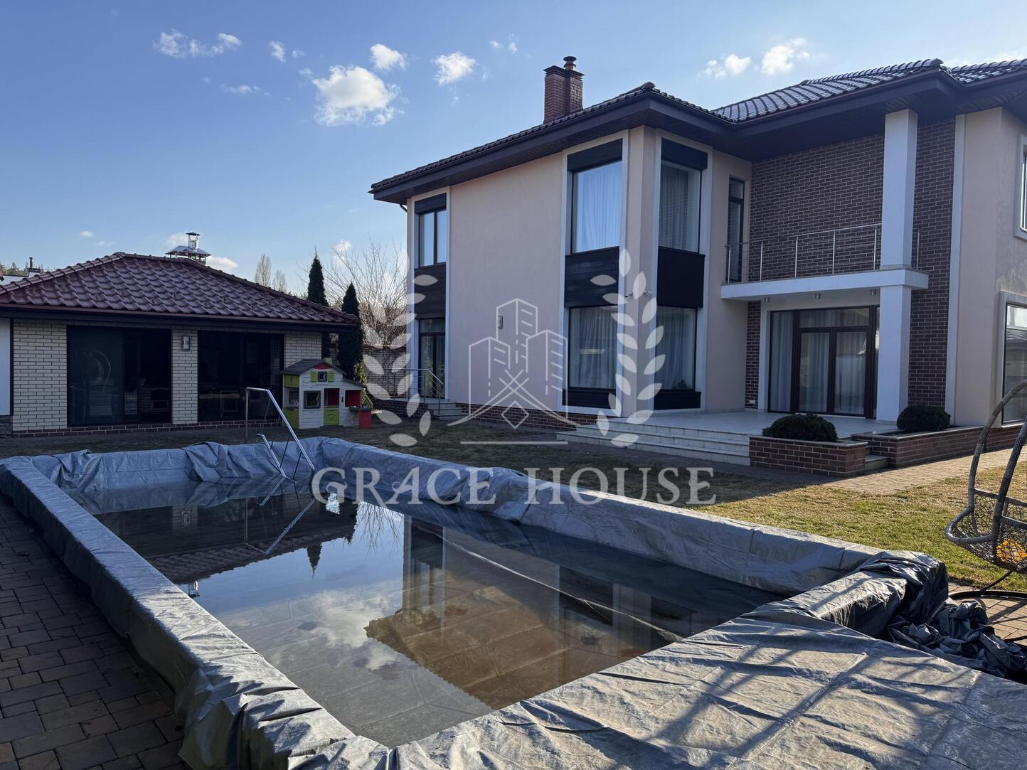 Аренда дома с бассейном рядом с лесом, село Горенка, Пуща-Водица, Бучанский район. Первая сдача. Дом 280м. кв., два этажа. 9 соток, бассейн с подогревом, беседка BBQ.