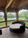 В доме 3 спальни, хозяйская со своим санузлом, гардеробные, гостинная-столовая, кухня, терраса, гараж на 2 автомобиля. В цокольном этаже - сауна, комната отдыха, игровая или спортзал, выход к наружному бассейну. На участке газон, автоматический полив, отдельно построена зона барбекю. Красивые панорамные виды, 10 минут до Печерска!