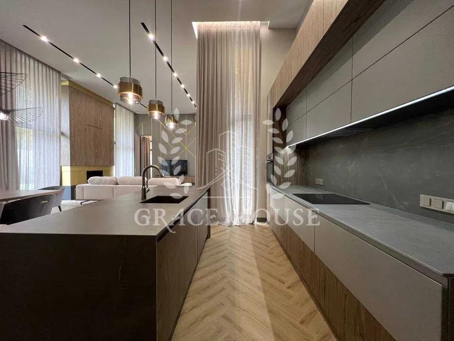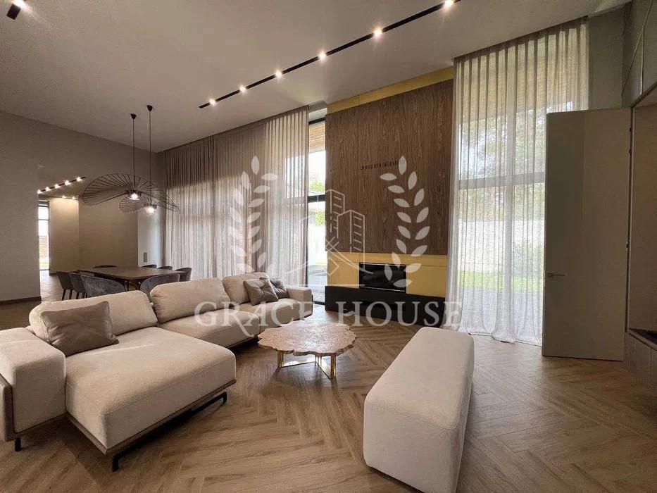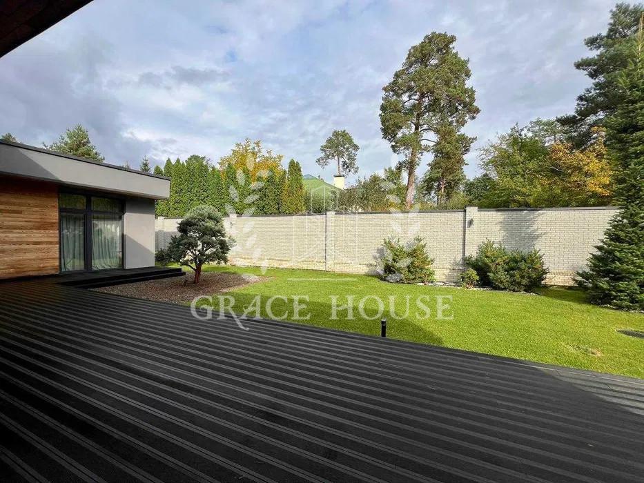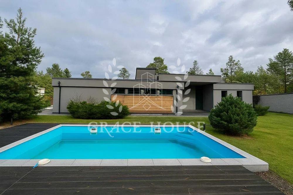 Конча-Заспа, Козин, продажа современного дома 250 м2 в сосновом лесу. Дом построен в одном уровне, что максимально комфортно для проживания. Просторная прихожая с гардеробом для верхней одежды и обуви, гостевой с/у, кухня-столовая, гостиная 55 м2 с высоким потолком, камин и панорамными окнами, а также выход на две террасы, внутреннюю и к бассейну.