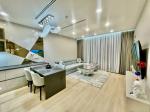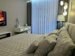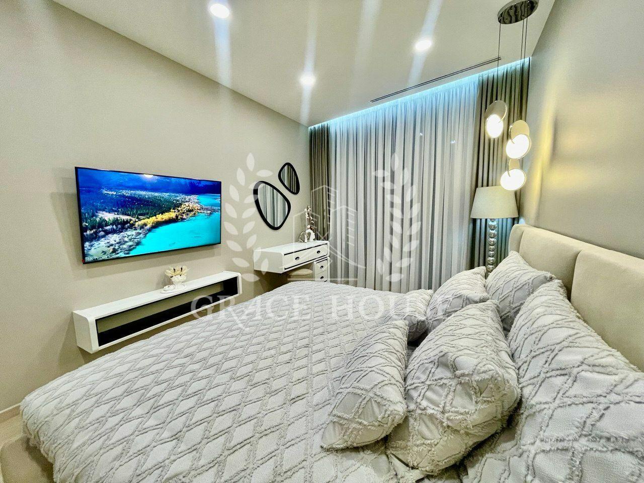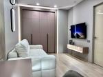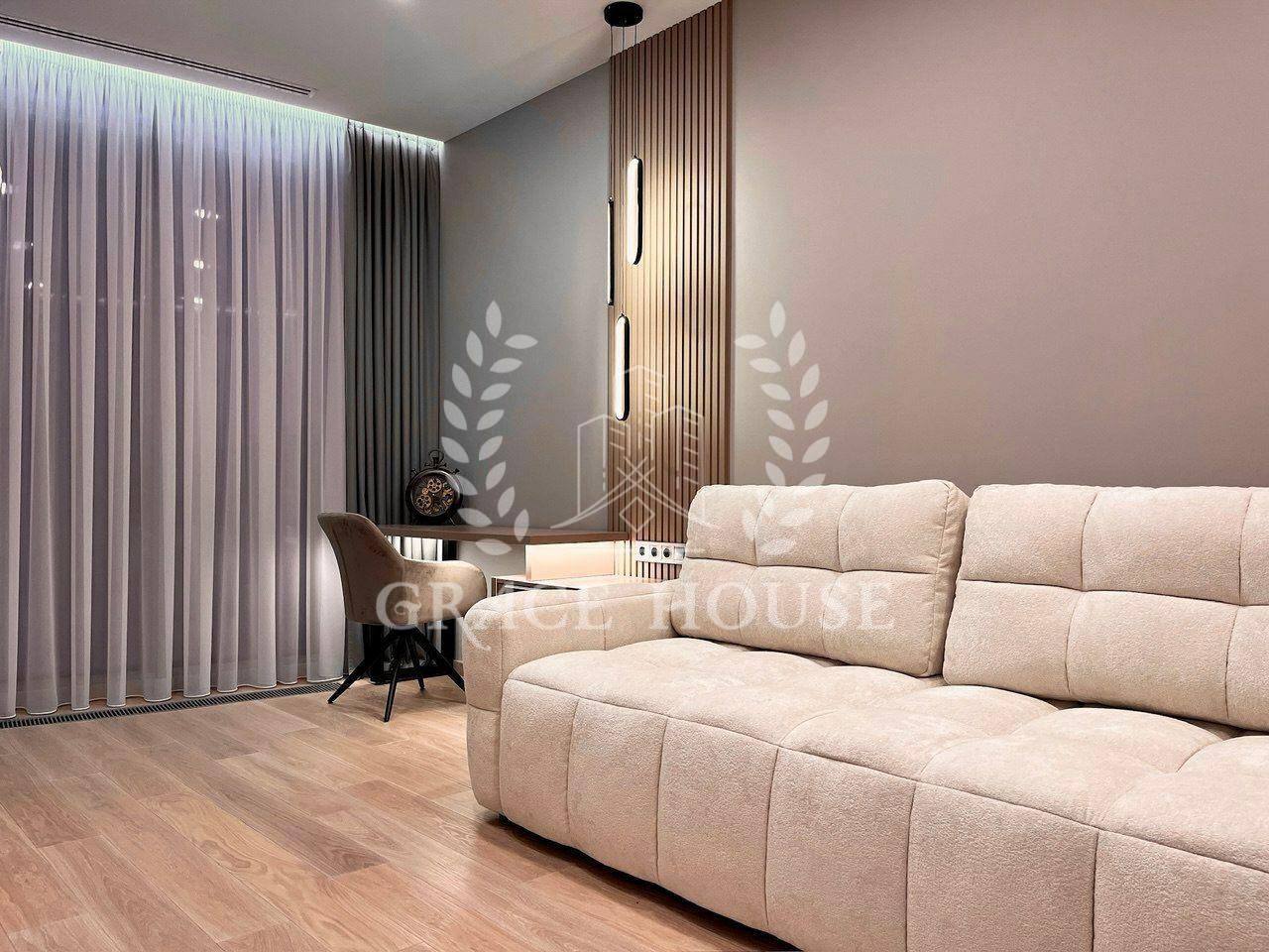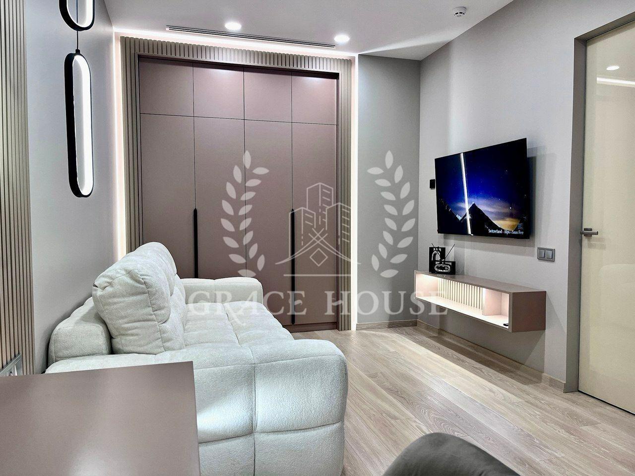 Сучасна квартира в ЖК Taryan Towers, готова до оренди. Стильний мінімалістичний дизайн у нейтральних тонах створює комфорт і простір. Кухня об’єднана з вітальнею, де розміщені зручні м’які меблі та великий телевізор.