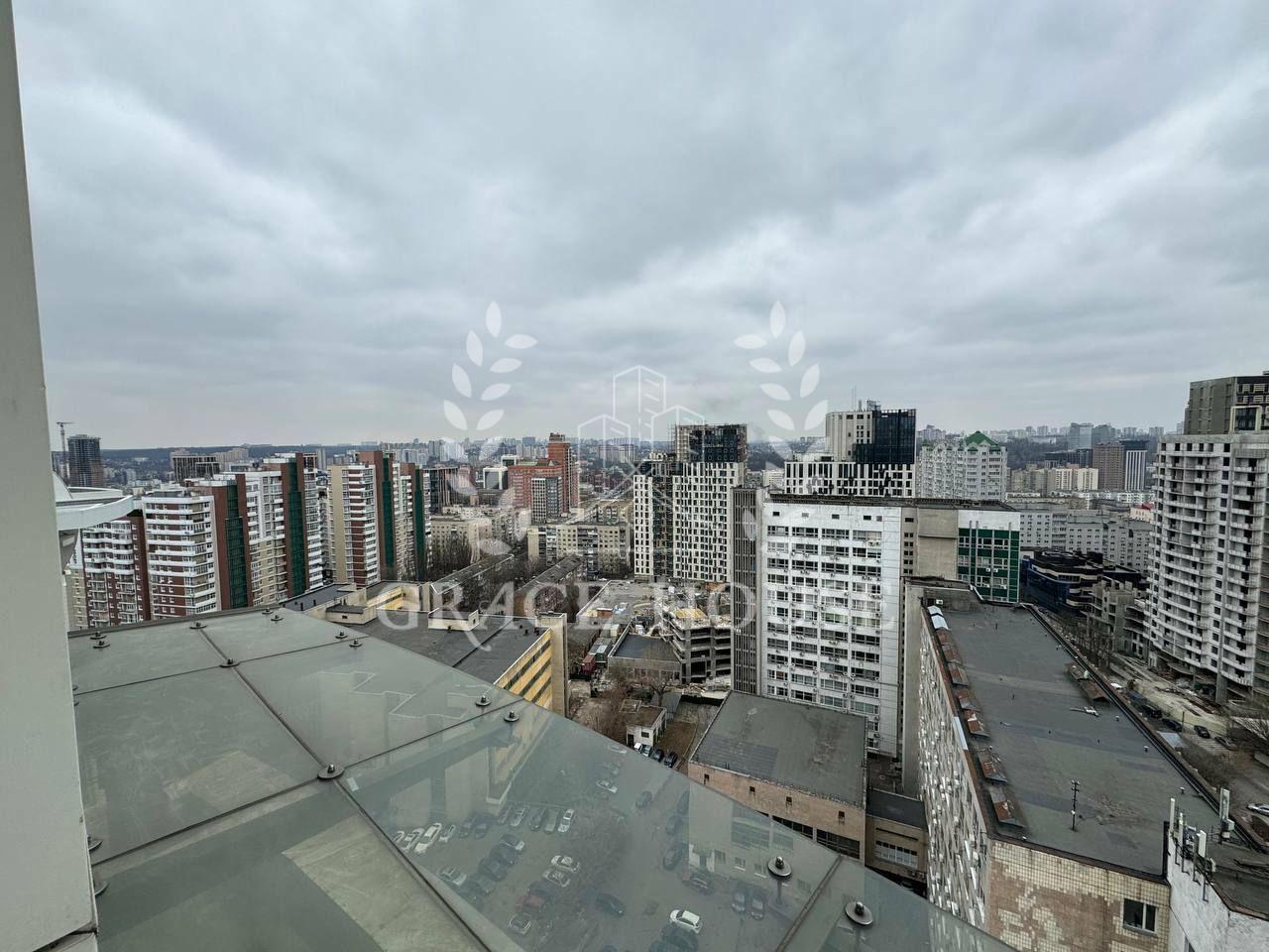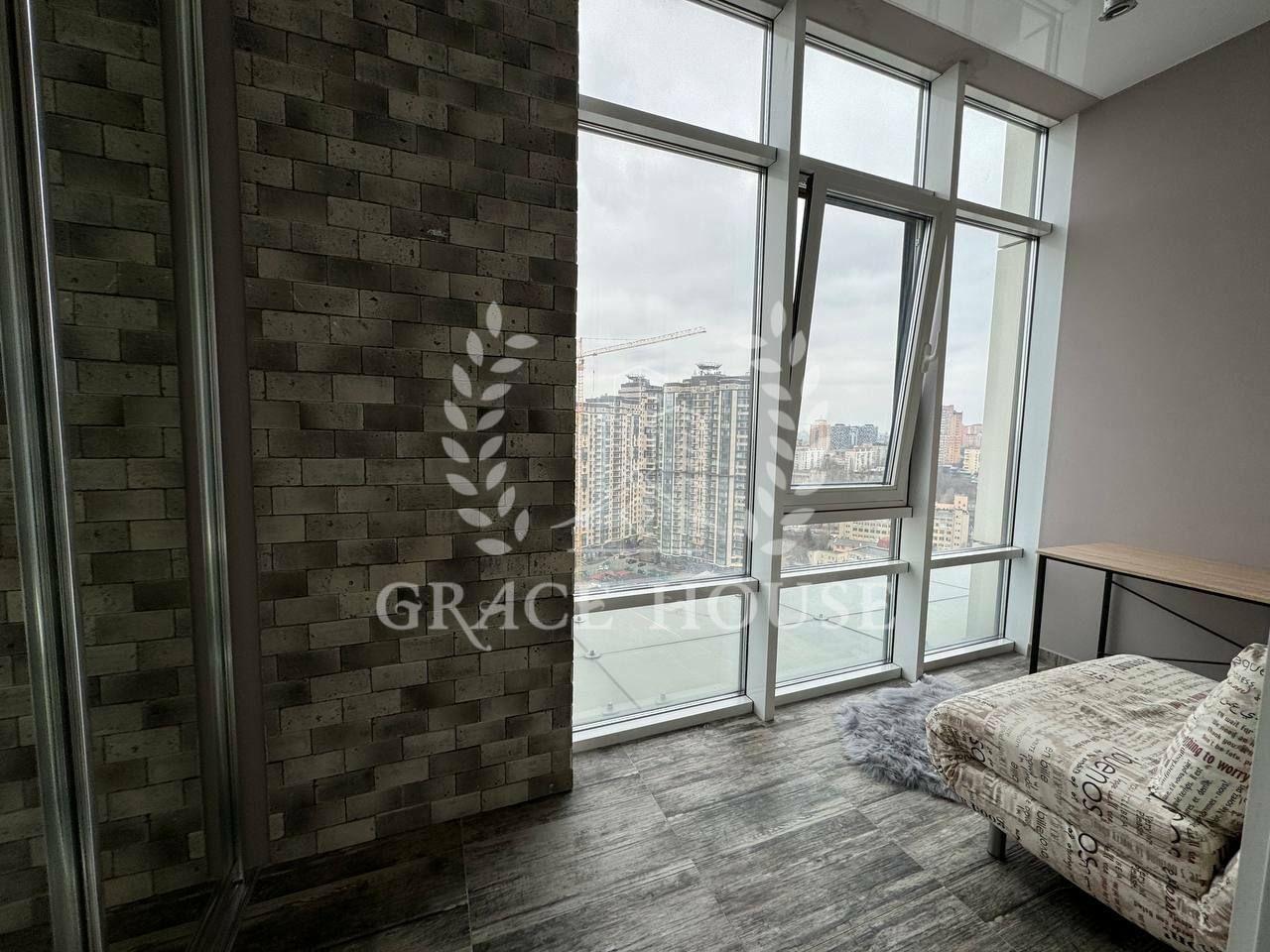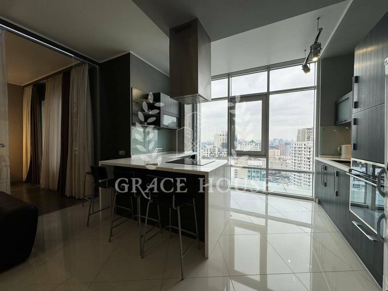 Планування квартири: кухня-вітальня з панорамними вікнами, простора спальня з гардеробною, засклений балкон та санвузол.
