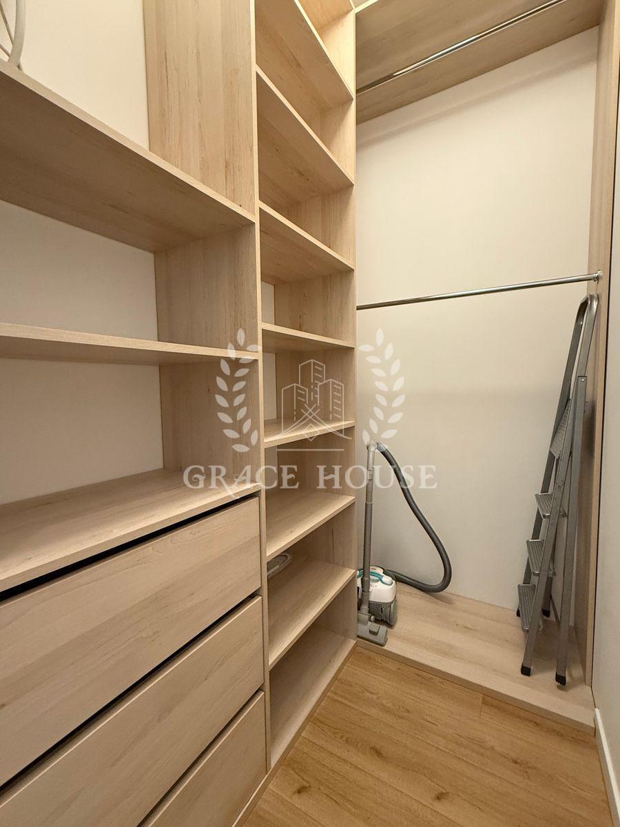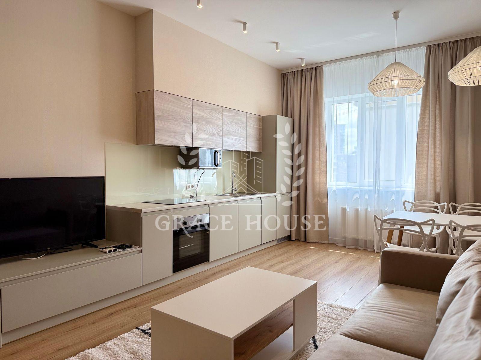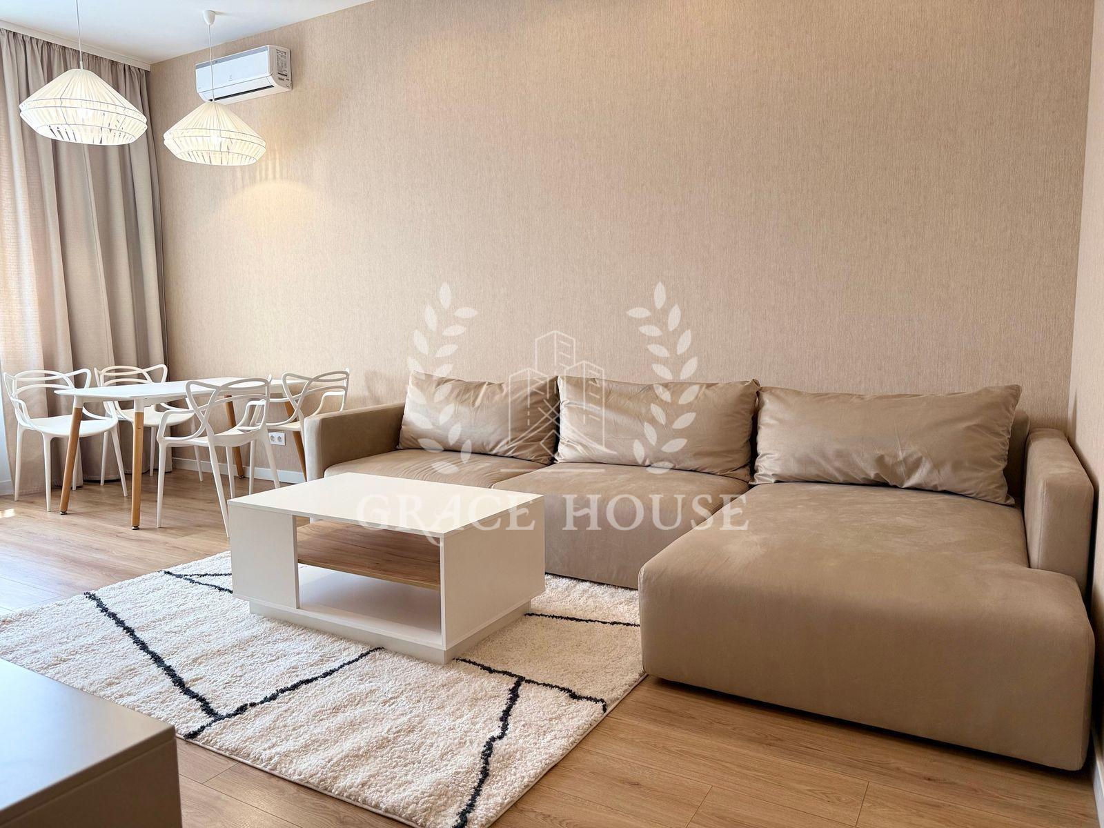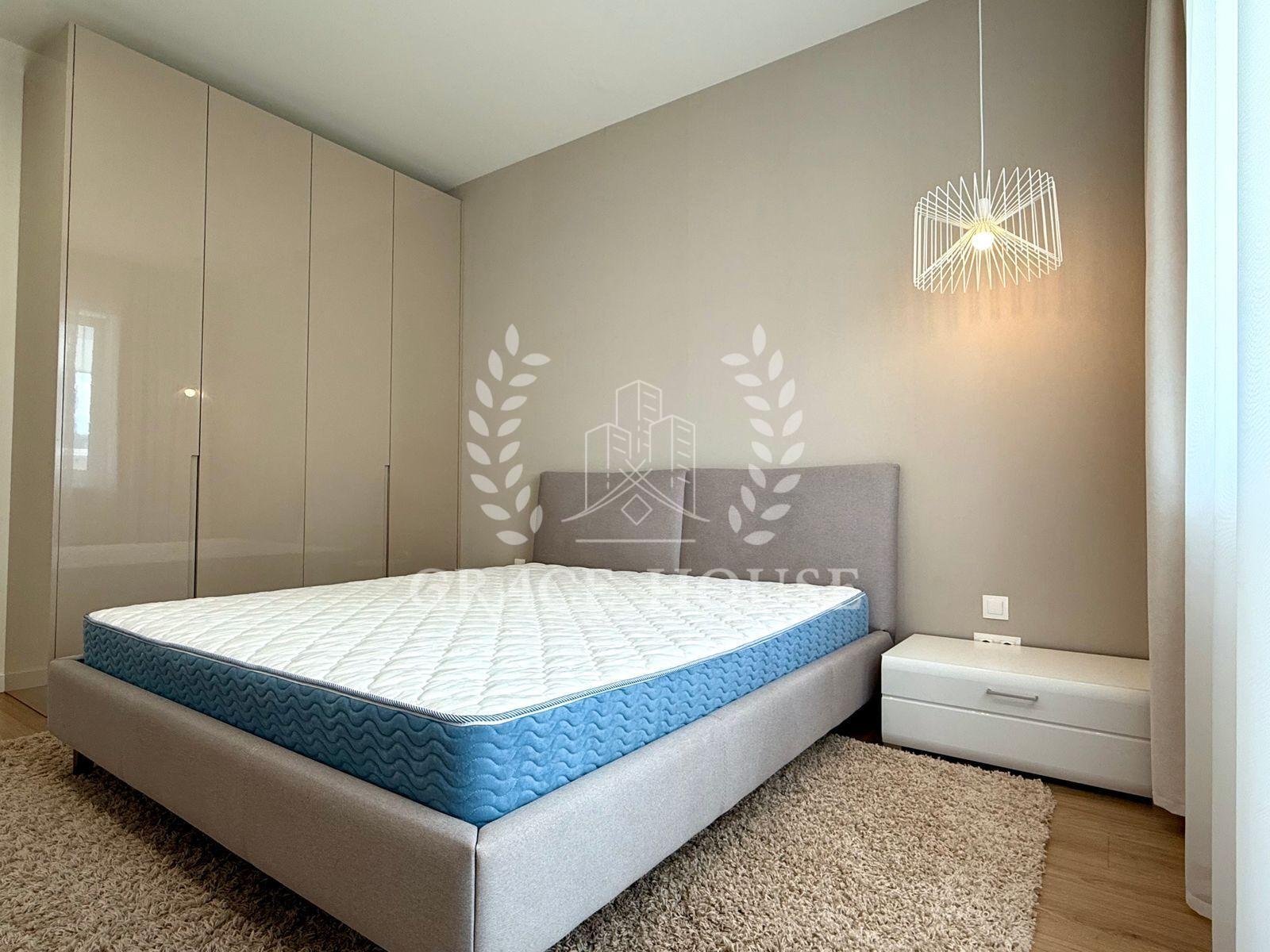 Світла стильна квартира з великою кухнею-вітальнею, оснащеною індукційною плитою, духовкою, холодильником, посудомийною машиною, кондиціонером і Smart TV. У спальні — двоспальне ліжко, кондиціонер, Smart TV та великий шафа-купе. Санвузол суміщений, є гардеробна.