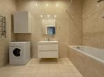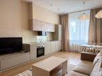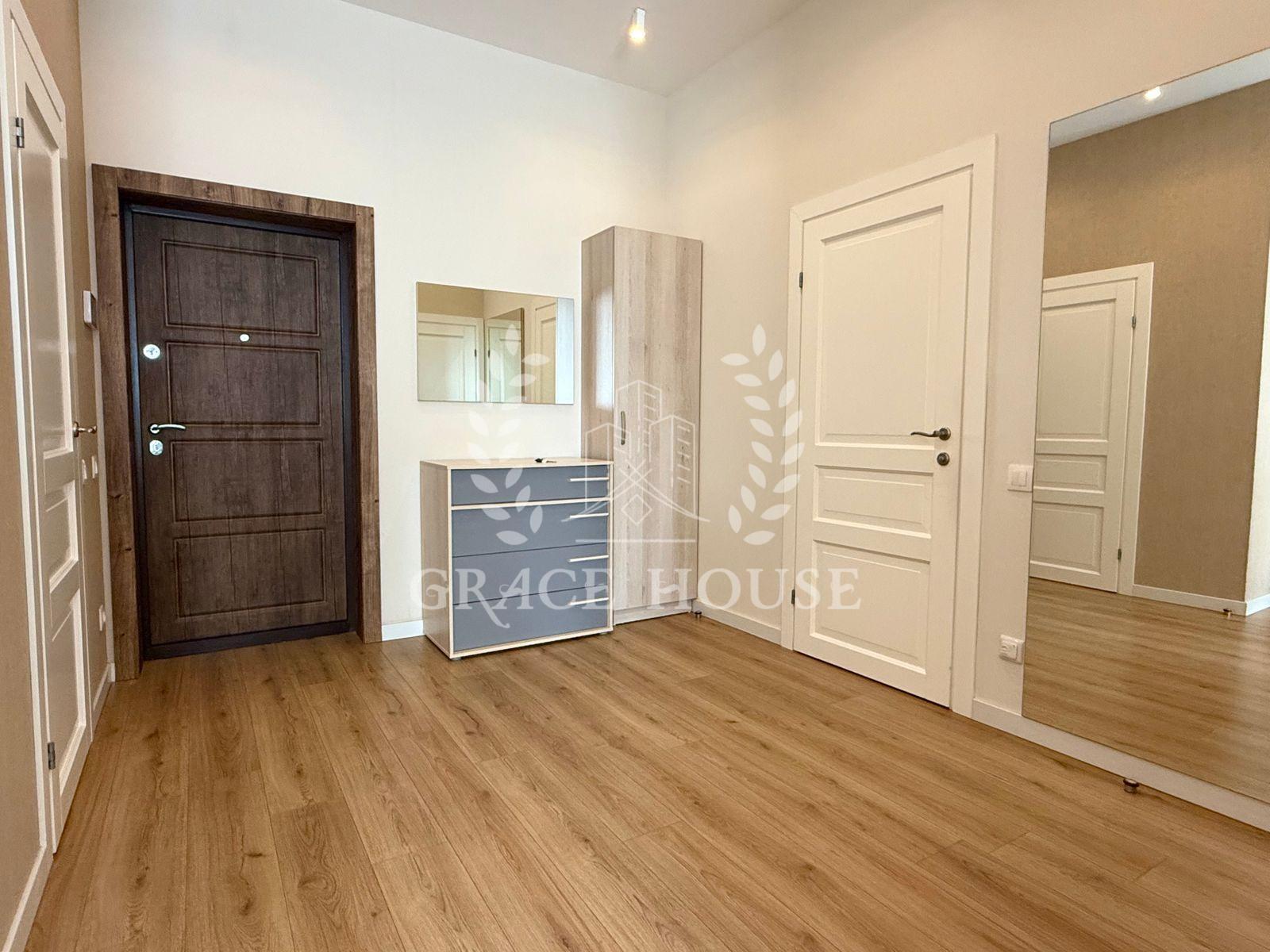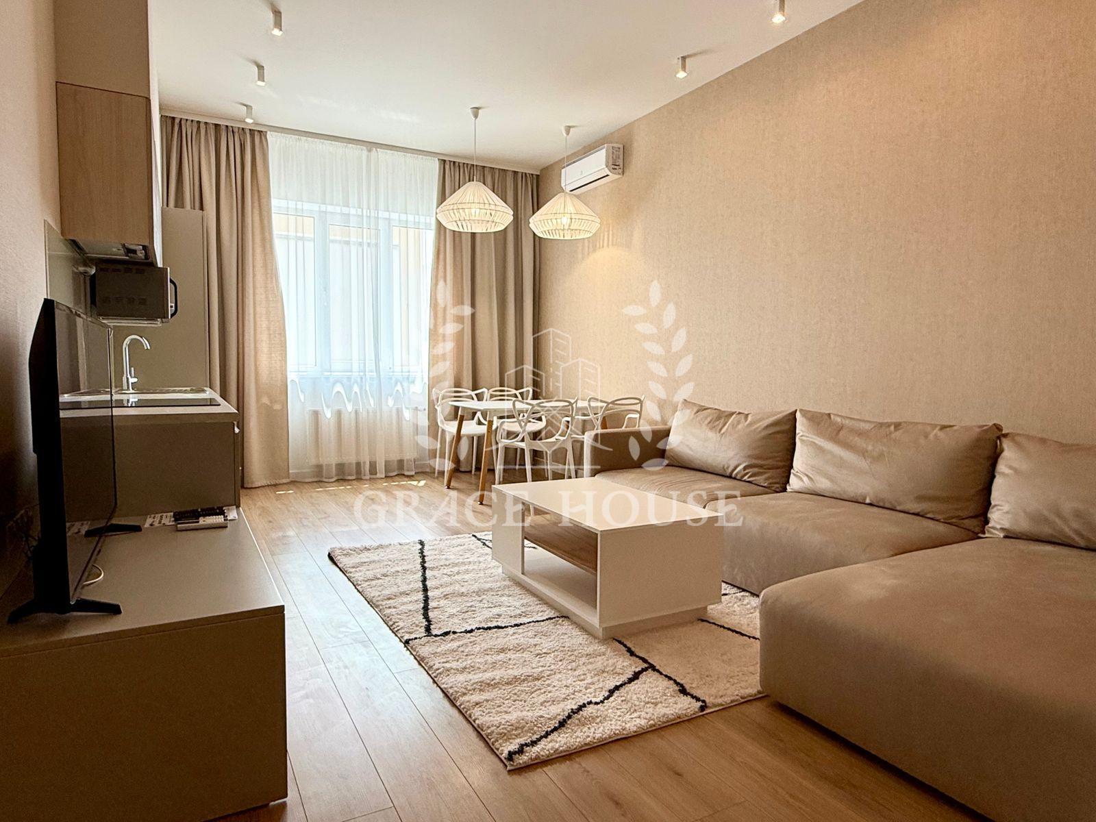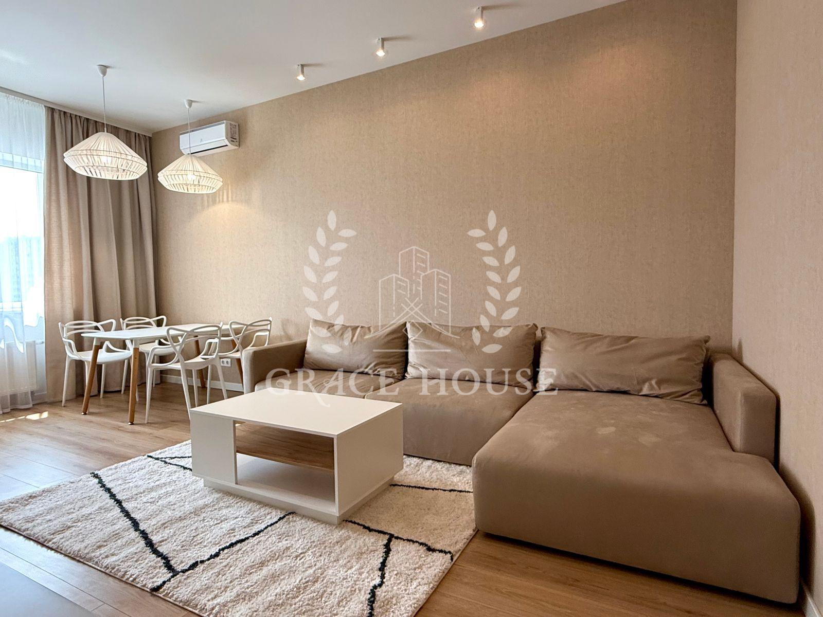 Світла стильна квартира з великою кухнею-вітальнею, оснащеною індукційною плитою, духовкою, холодильником, посудомийною машиною, кондиціонером і Smart TV. У спальні — двоспальне ліжко, кондиціонер, Smart TV та великий шафа-купе. Санвузол суміщений, є гардеробна.