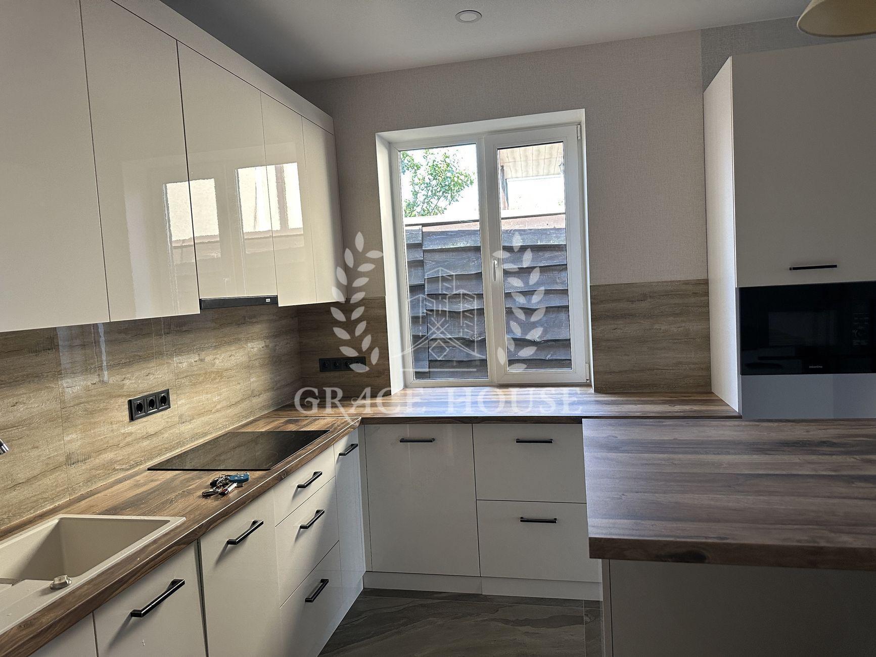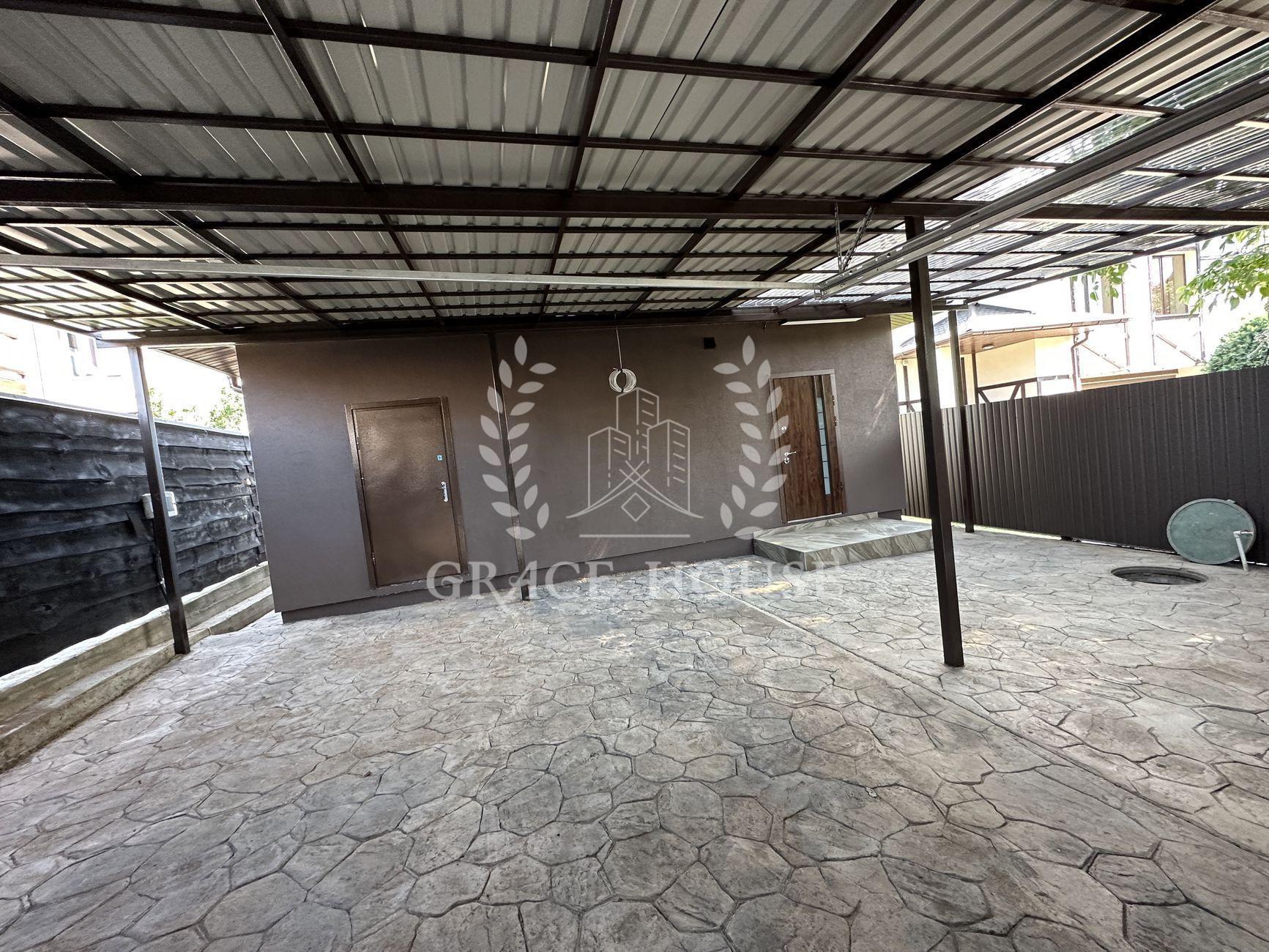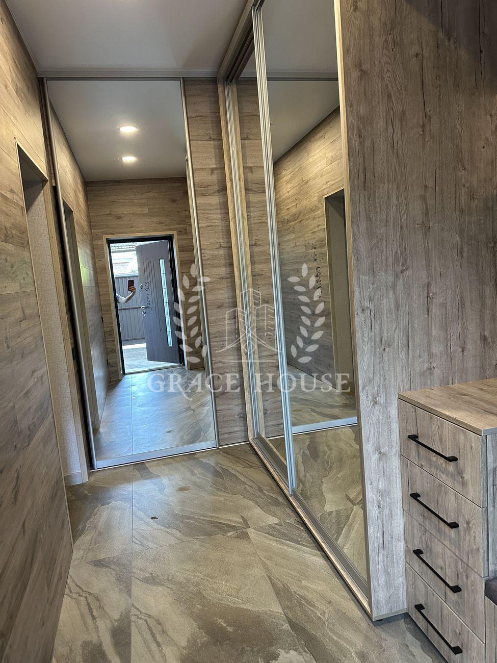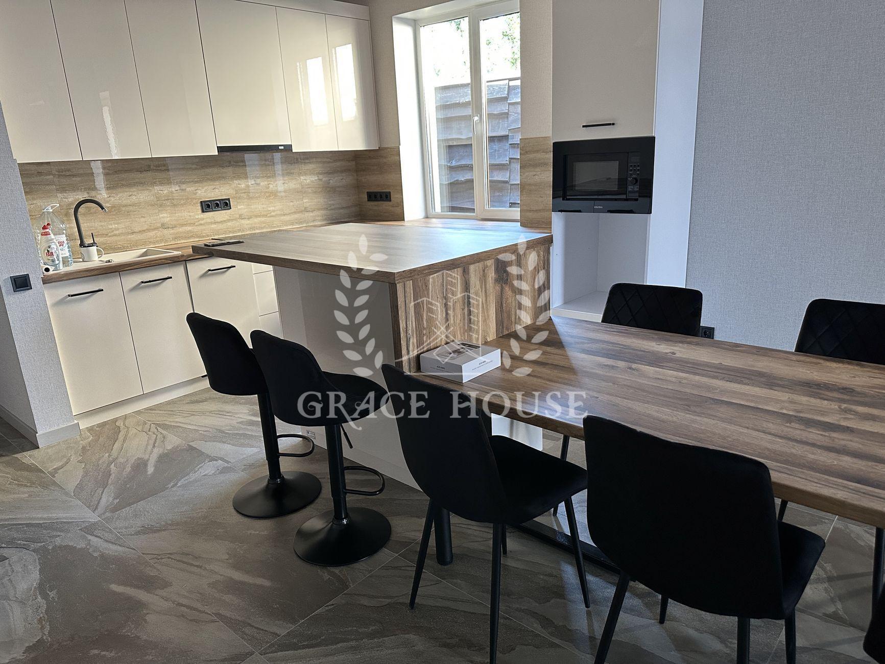 В доме - 3 комнаты и большой open-space зал-кухня с выходом на террасу, 2 гардеробные комнаты (одну из них можно использовать в качестве укрытия), 2 сан-узла. Отдельно - котельная, в которой находятся электрокотёл, бойлер на 200 л и очистные фильтры для воды. Дом полностью меблирован и укомплектован новой бытовой техникой (стиралка, духовка, микроволновка, посудомоечная машина, варочная поверхность).
