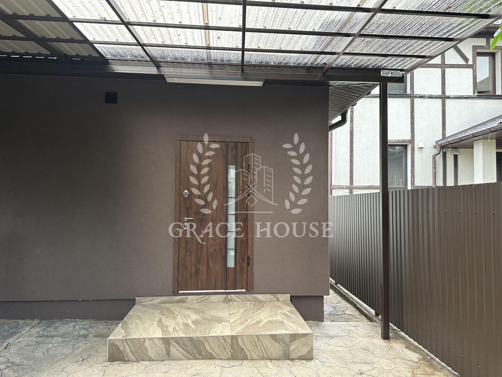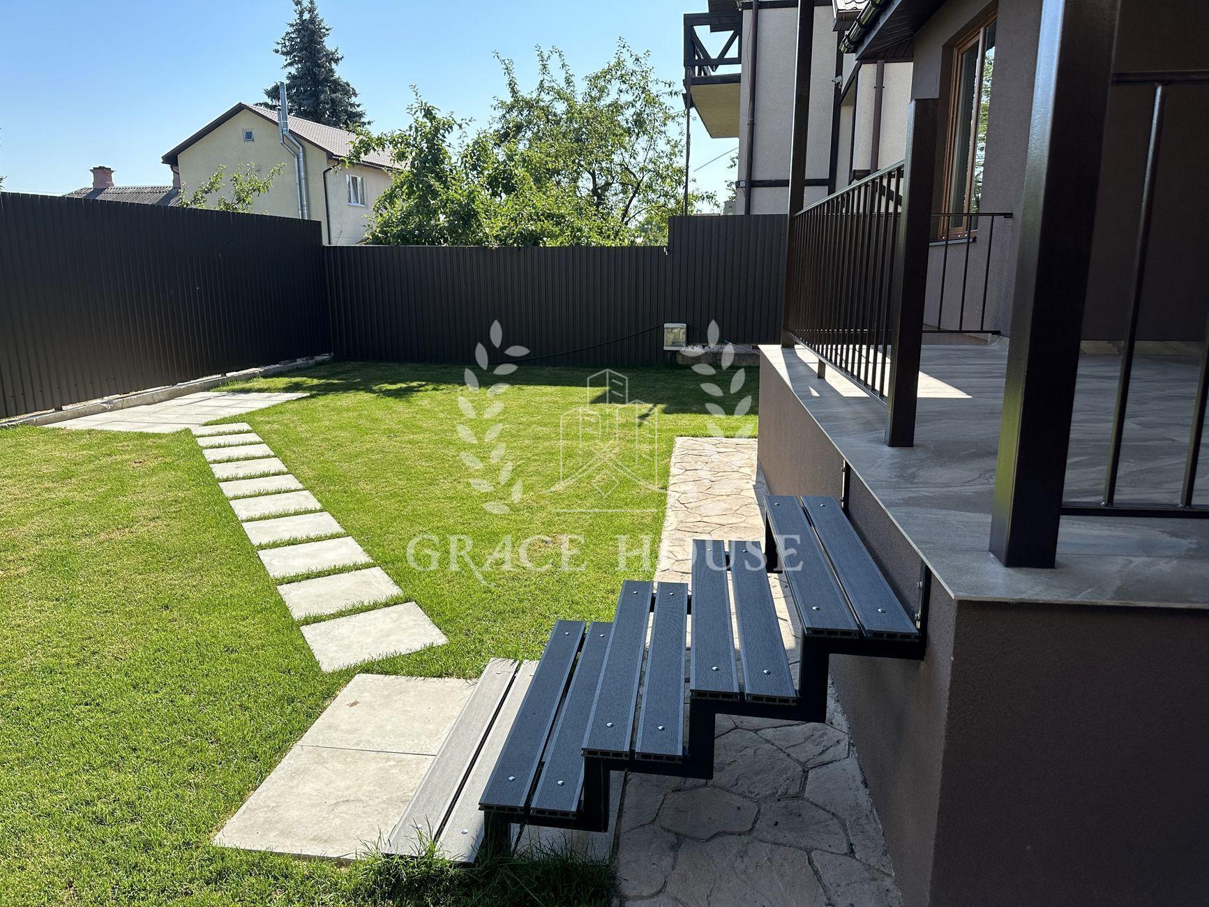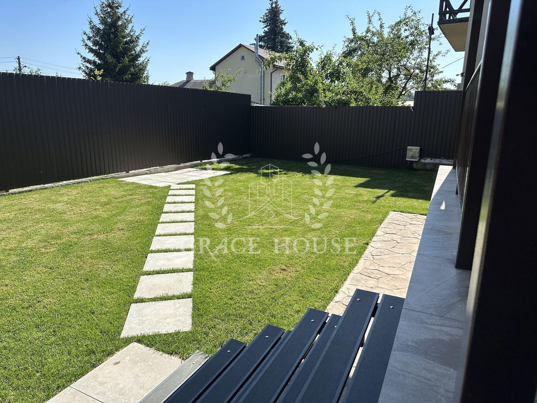 Территория участка - 5 соток. На территории - автонавес на 2 автомобиля с электрическими воротами, большой двор под прозрачным навесом (снег и дождь не попадает). На заднем дворе - газон с автоматическим поливом, зона барбекю и меблированная терраса.