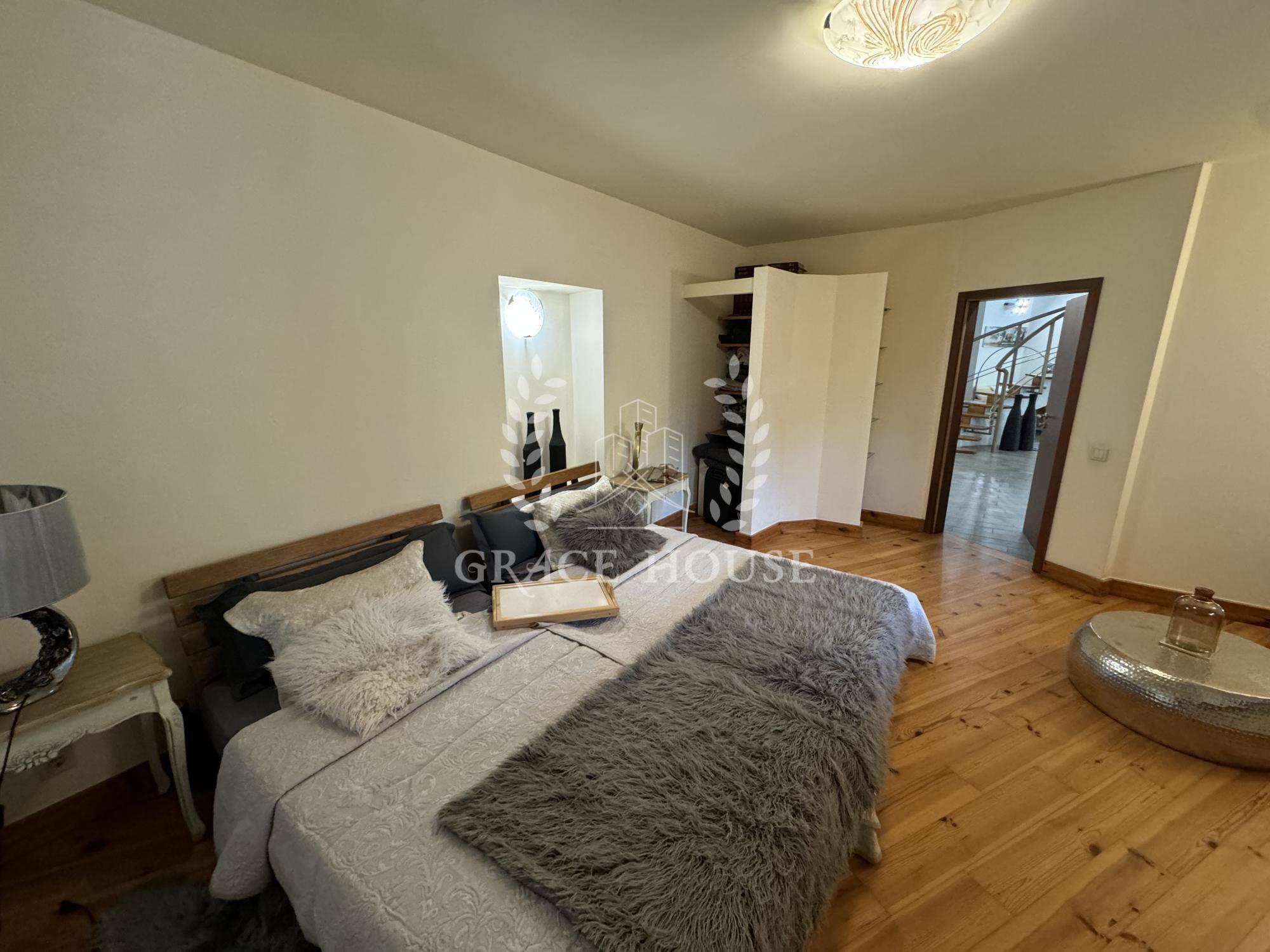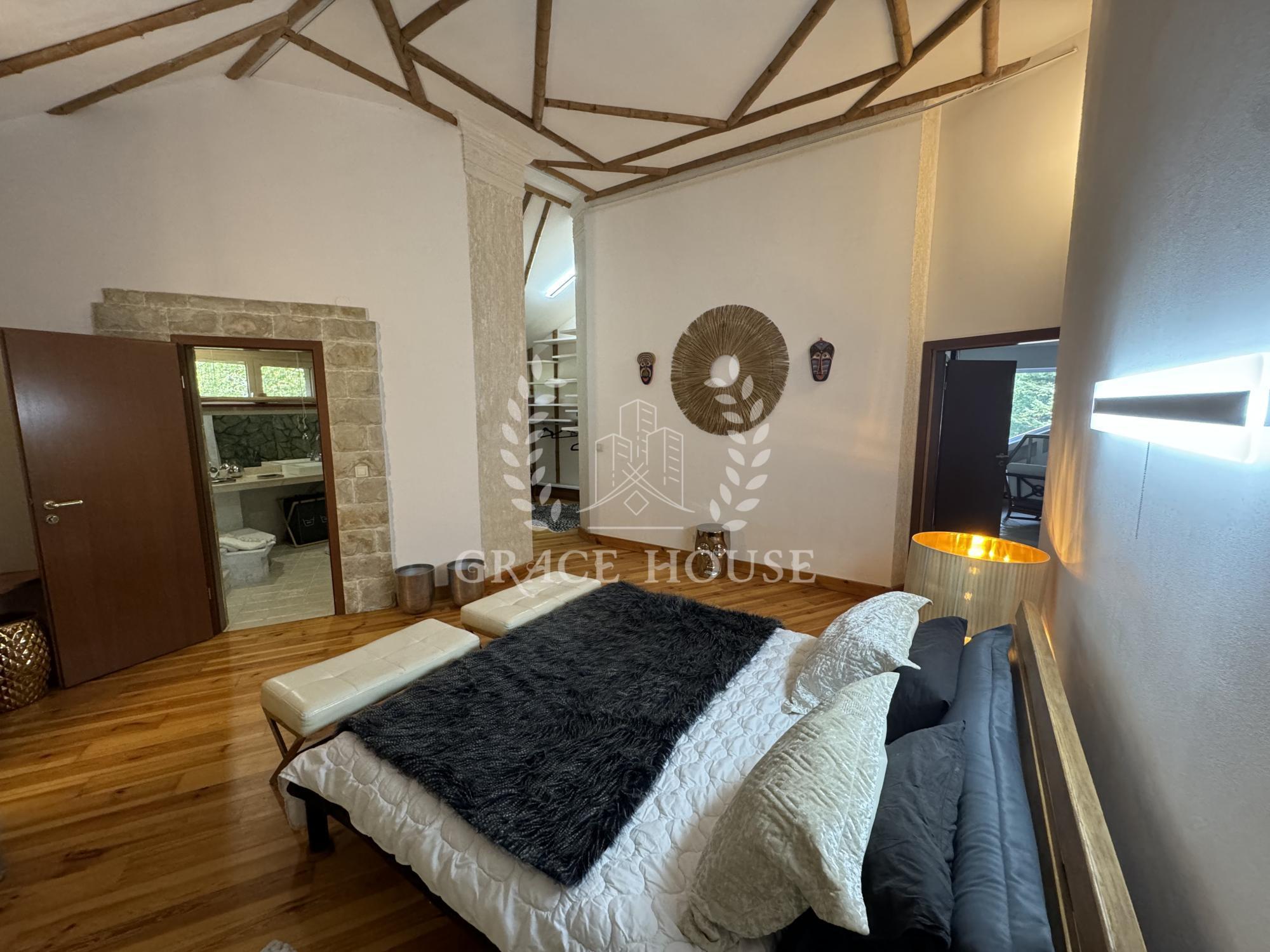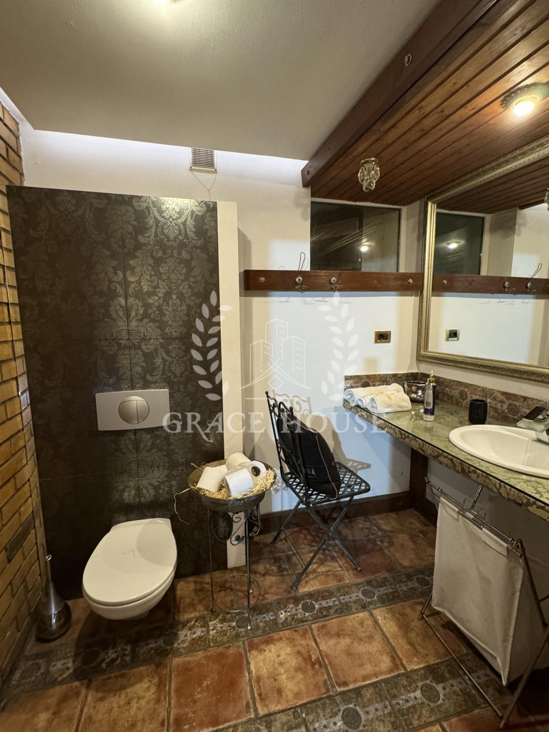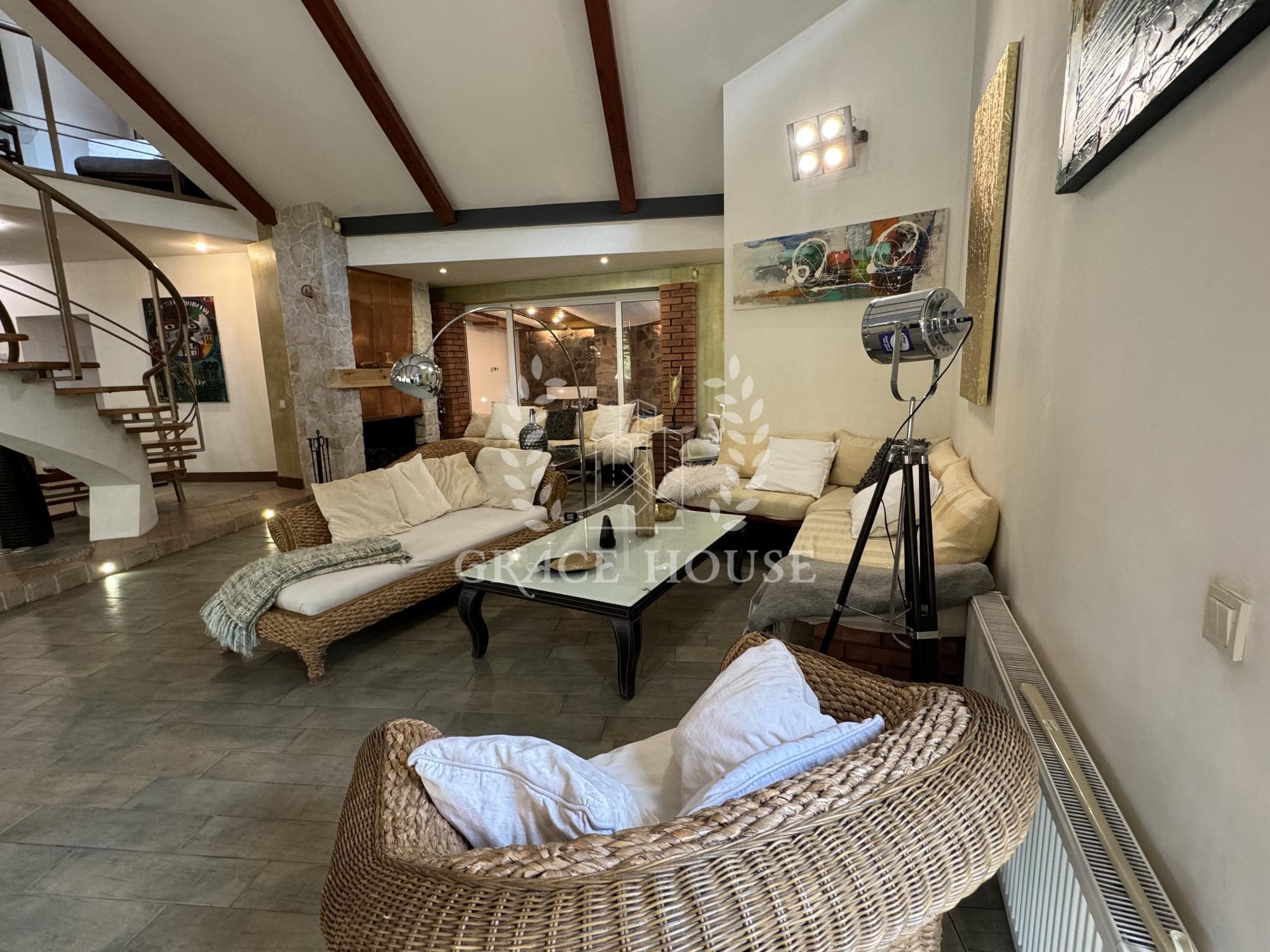На первом этаже расположены просторная кухня-столовая, гостиная с камином, гостевая спальня с с/у, выход на террасу. А также отдельная спа-зона с бассейном с противотоком и сауной, кладовая, гардеробная. Второй свет, дизайнеркий ремонт в эстетическом стиле.