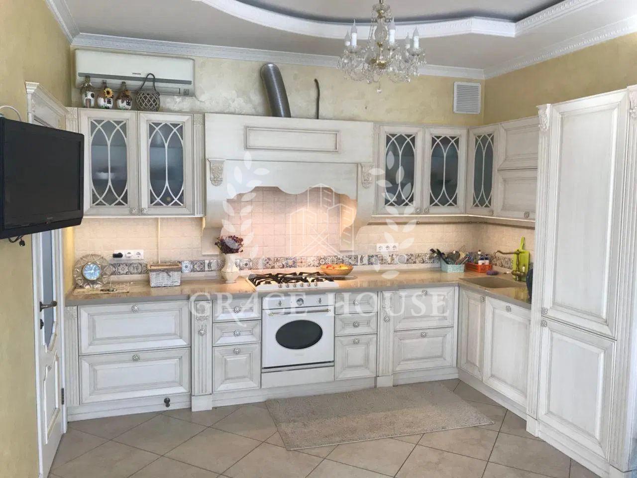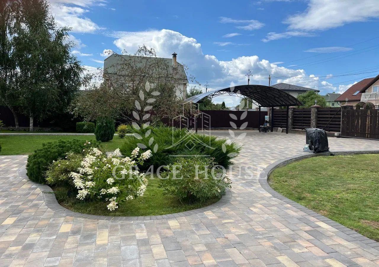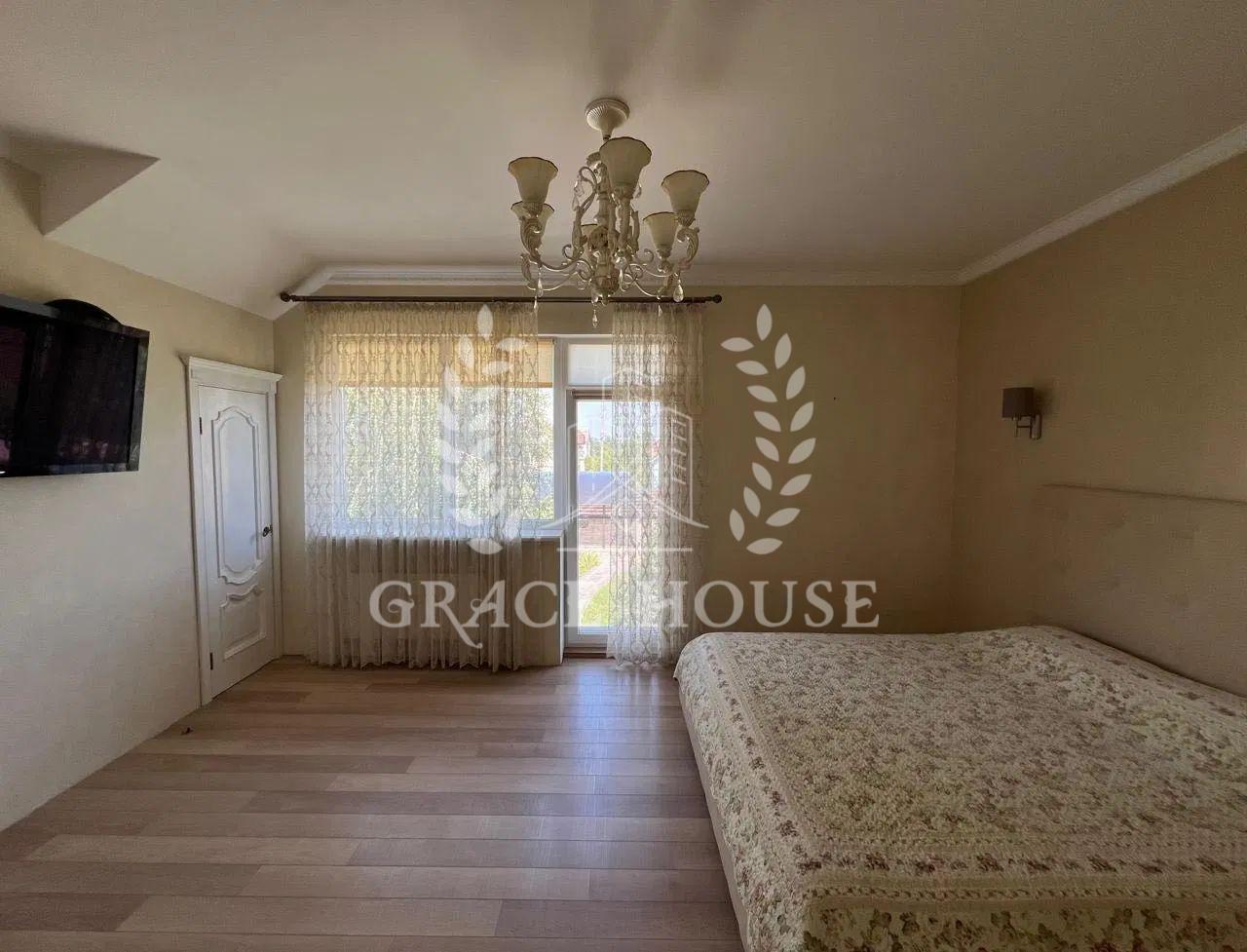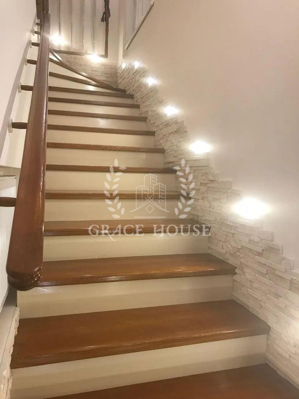 На першому поверсі знаходиться: передпокій зі шафою купе, тумбою для взуття та пуфом, простора вітальня з декоративними нішами у вигляді полиць, кутовим диваном та телевізором, кухня-столова з панорамними вікнами обладнана вбудованою кухнею з технікою та виходом на терасу, господарська кімната (газовий котел, пральна машина, бойлер на 200 літрів, очисна система для води), просторий сан вузол із ванною-джакузі, кабінет з вбудованою до стелі шафою. Відкрита літня тераса з меблями із ротангу.