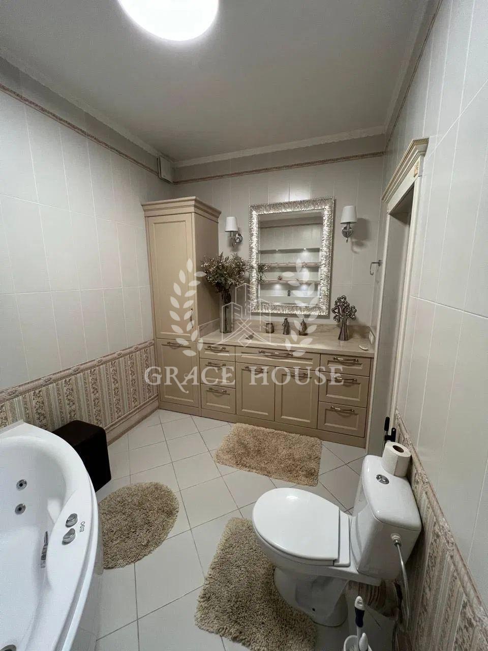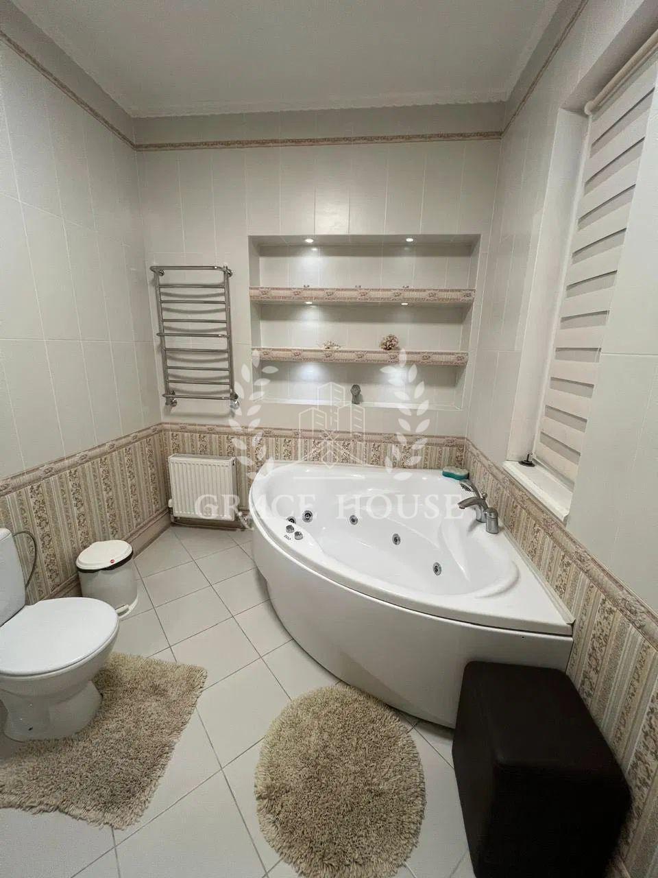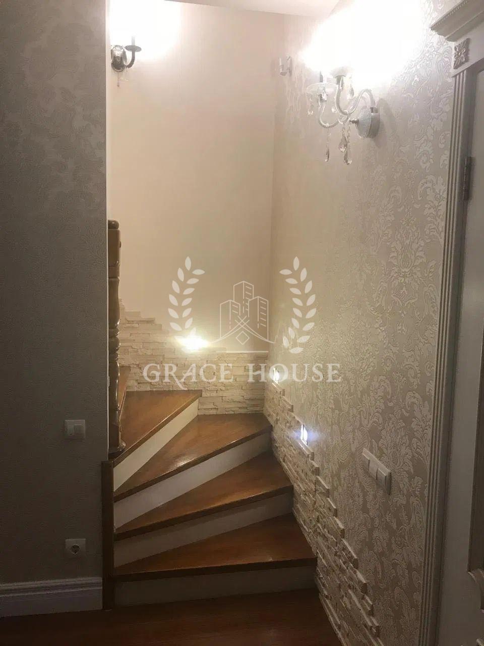 На першому поверсі знаходиться: передпокій зі шафою купе, тумбою для взуття та пуфом, простора вітальня з декоративними нішами у вигляді полиць, кутовим диваном та телевізором, кухня-столова з панорамними вікнами обладнана вбудованою кухнею з технікою та виходом на терасу, господарська кімната (газовий котел, пральна машина, бойлер на 200 літрів, очисна система для води), просторий сан вузол із ванною-джакузі, кабінет з вбудованою до стелі шафою. Відкрита літня тераса з меблями із ротангу.