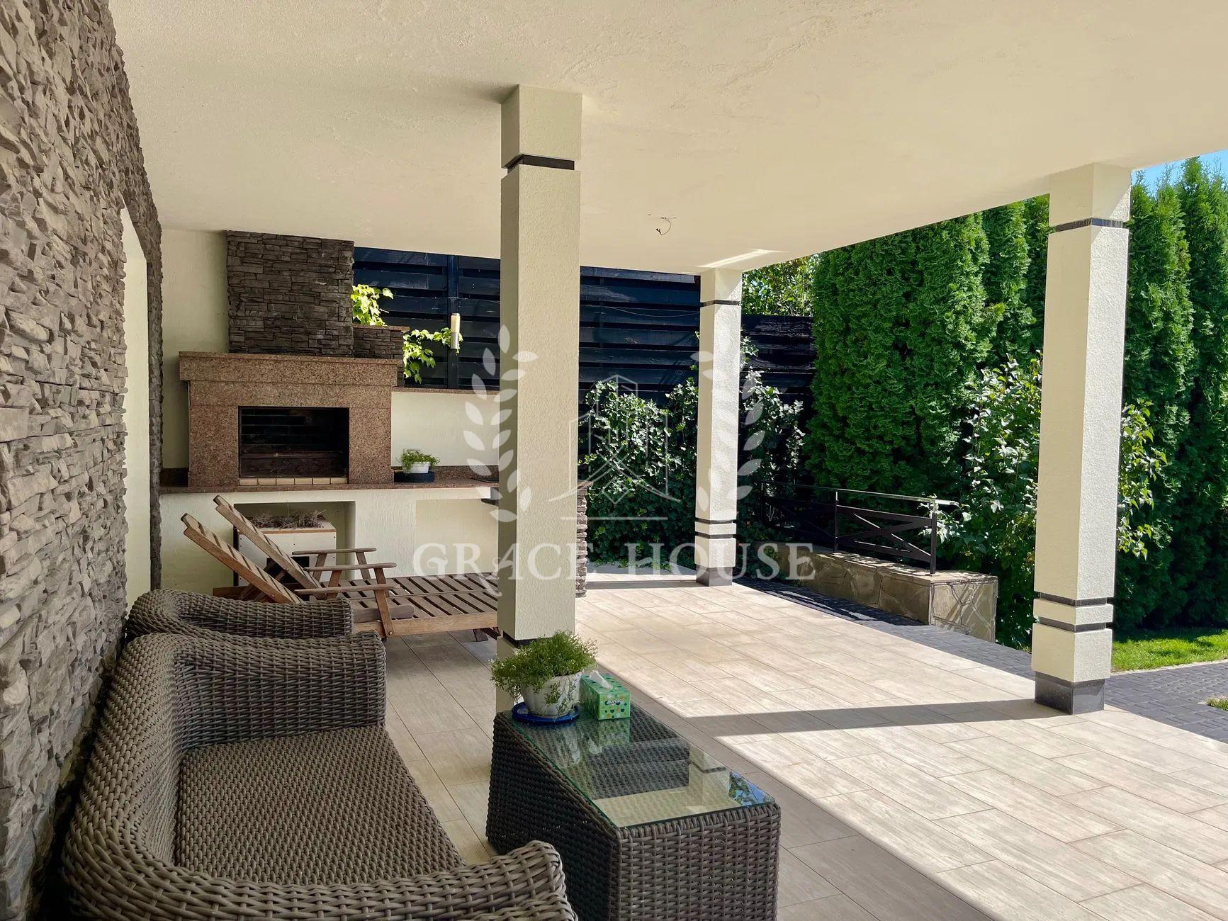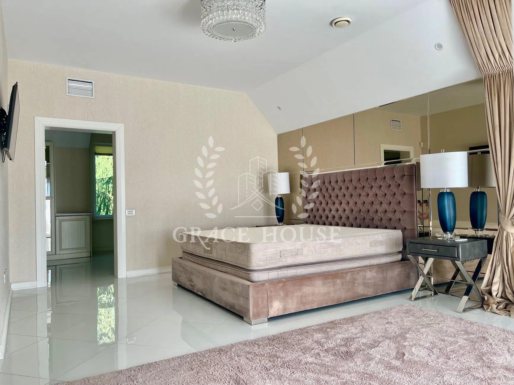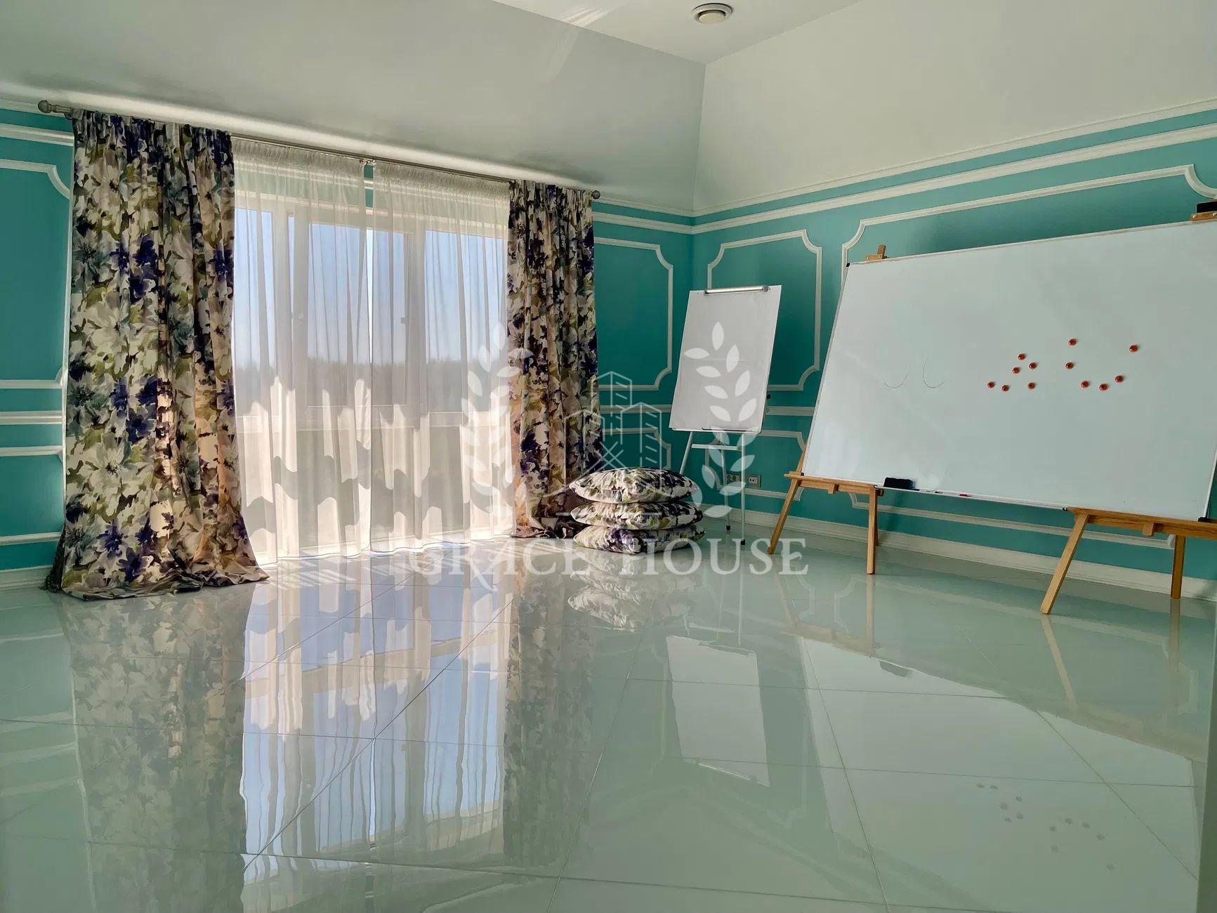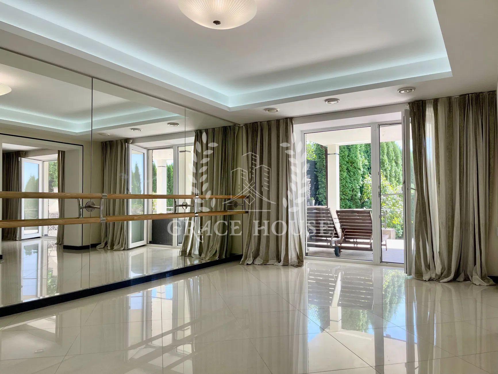 Планування: вітальня, кухня-студія з виходом у двір, три спальні кімнати, кабінет (четверта спальня), 4 сан.вузла 3 гардеробні кімнати, SPA-зона з сауною та кімнатою відпочинку, гараж на 2 авто, цокольний поверх з великою гардеробною для сезонного одягу.