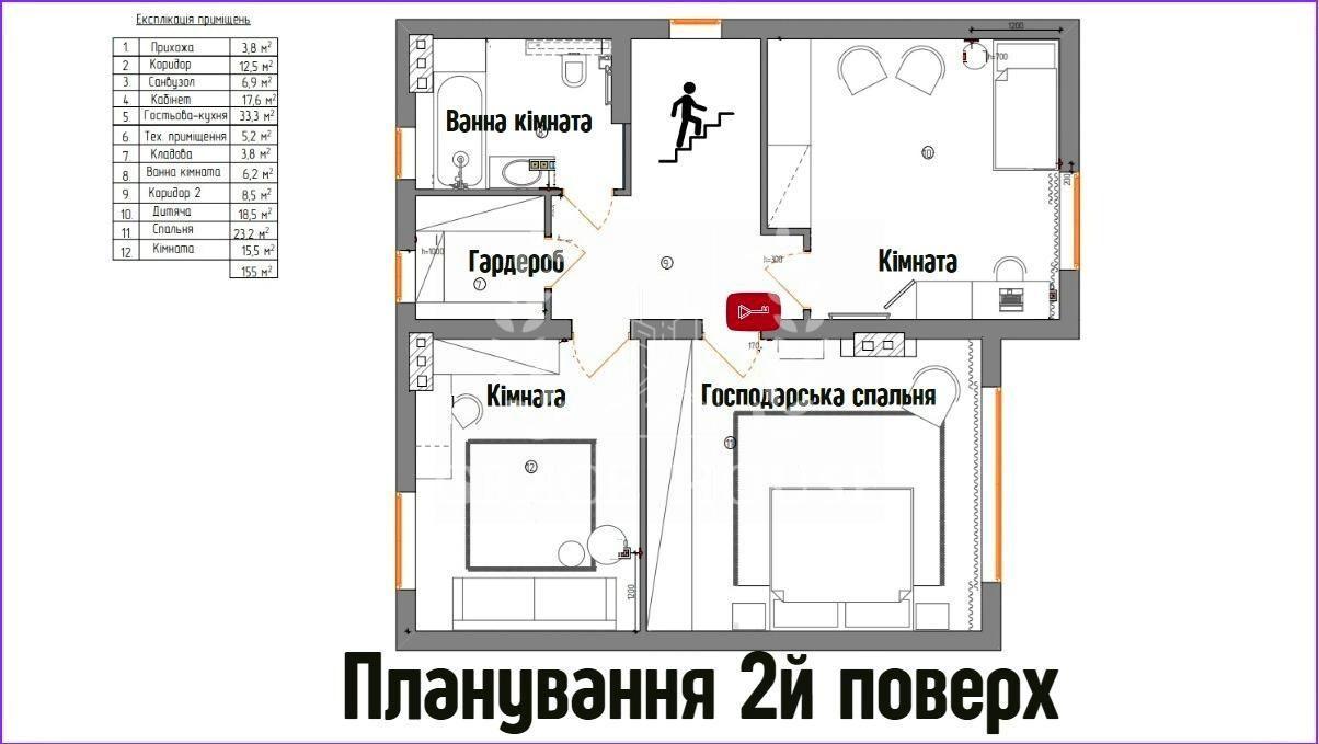 Поверх 2: 3 спальні, 1 санвузол з ванною. Гардероб. Є горищне приміщення.