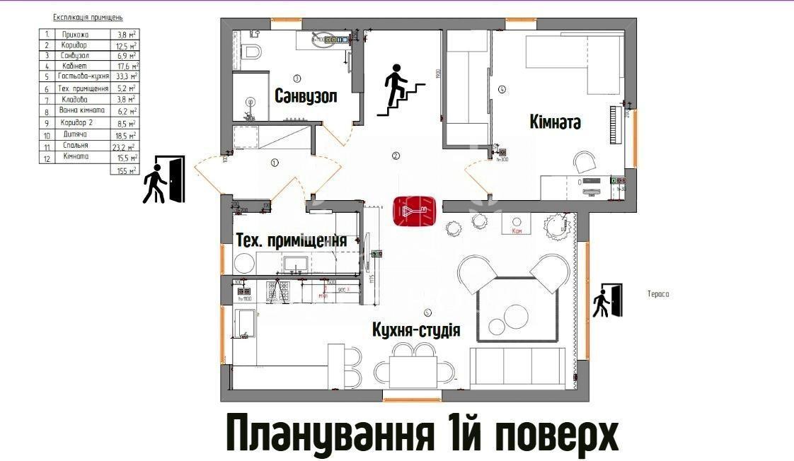 Поверх 1: Коридор, тех. приміщення, санвузол з душовою, кухня з великою вітальнею і каміном. Спальня або під кабінет.