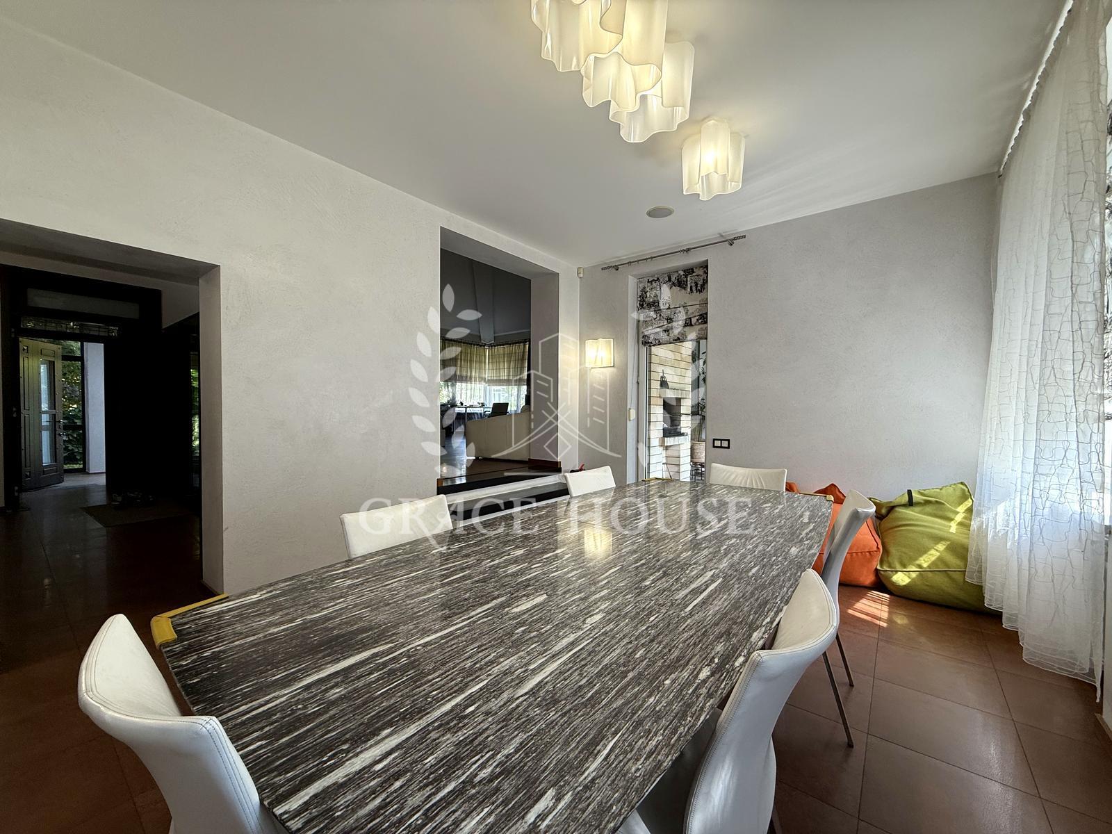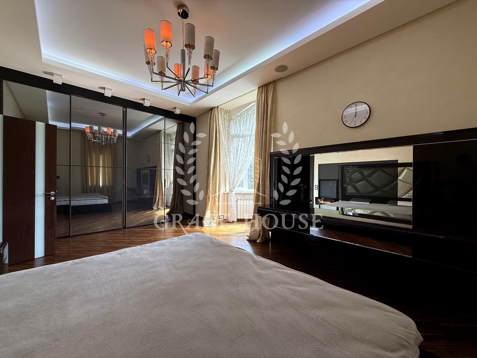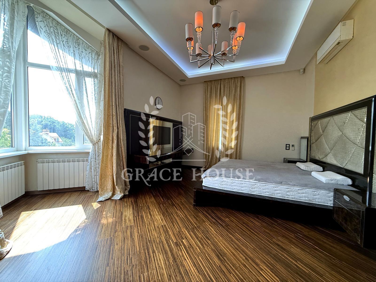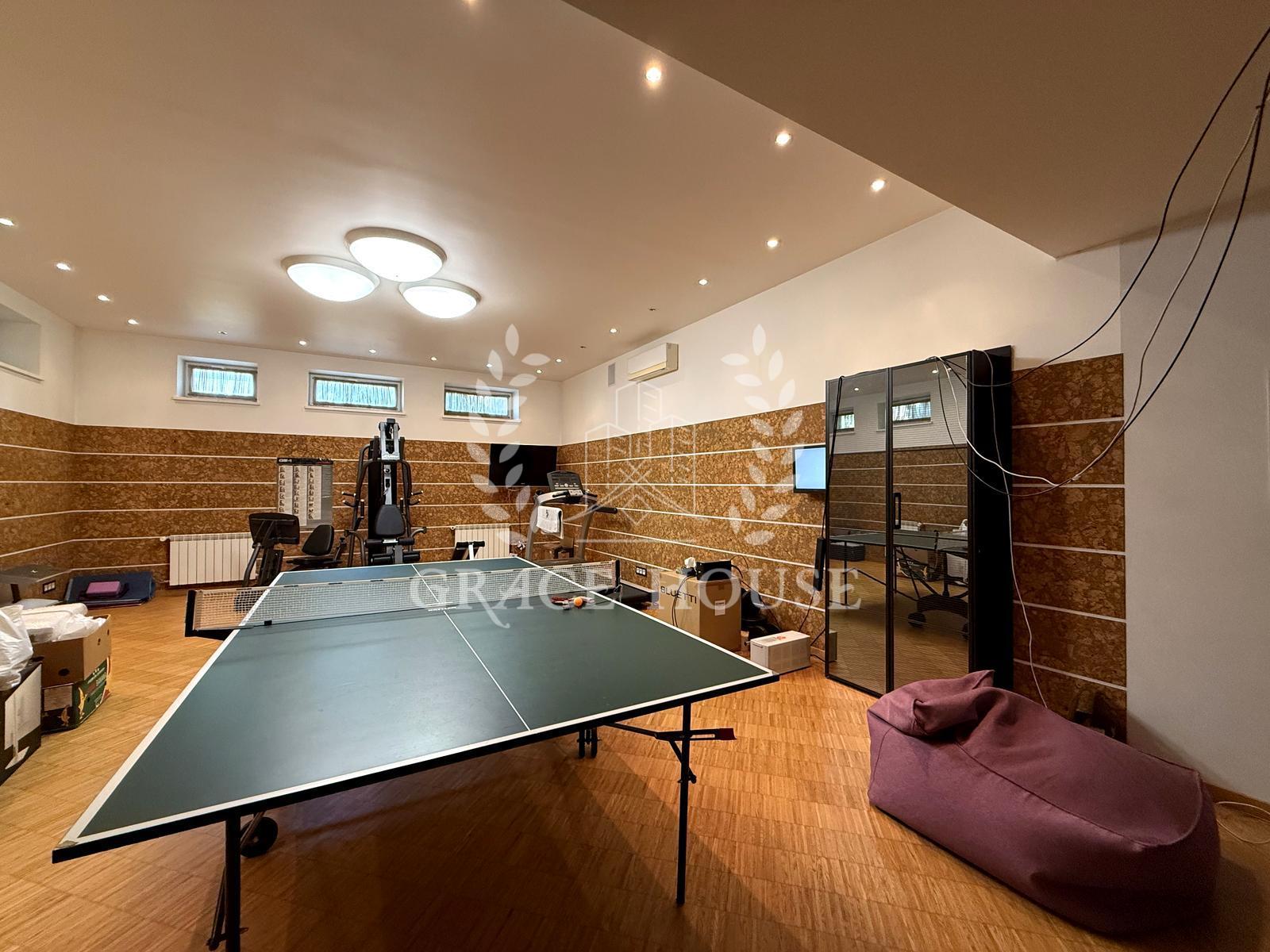 Вітальня з каміном, кухня-їдальня, зимовий сад, 4 спальні + кабінет, спортзал, фінська сауна, гараж.
