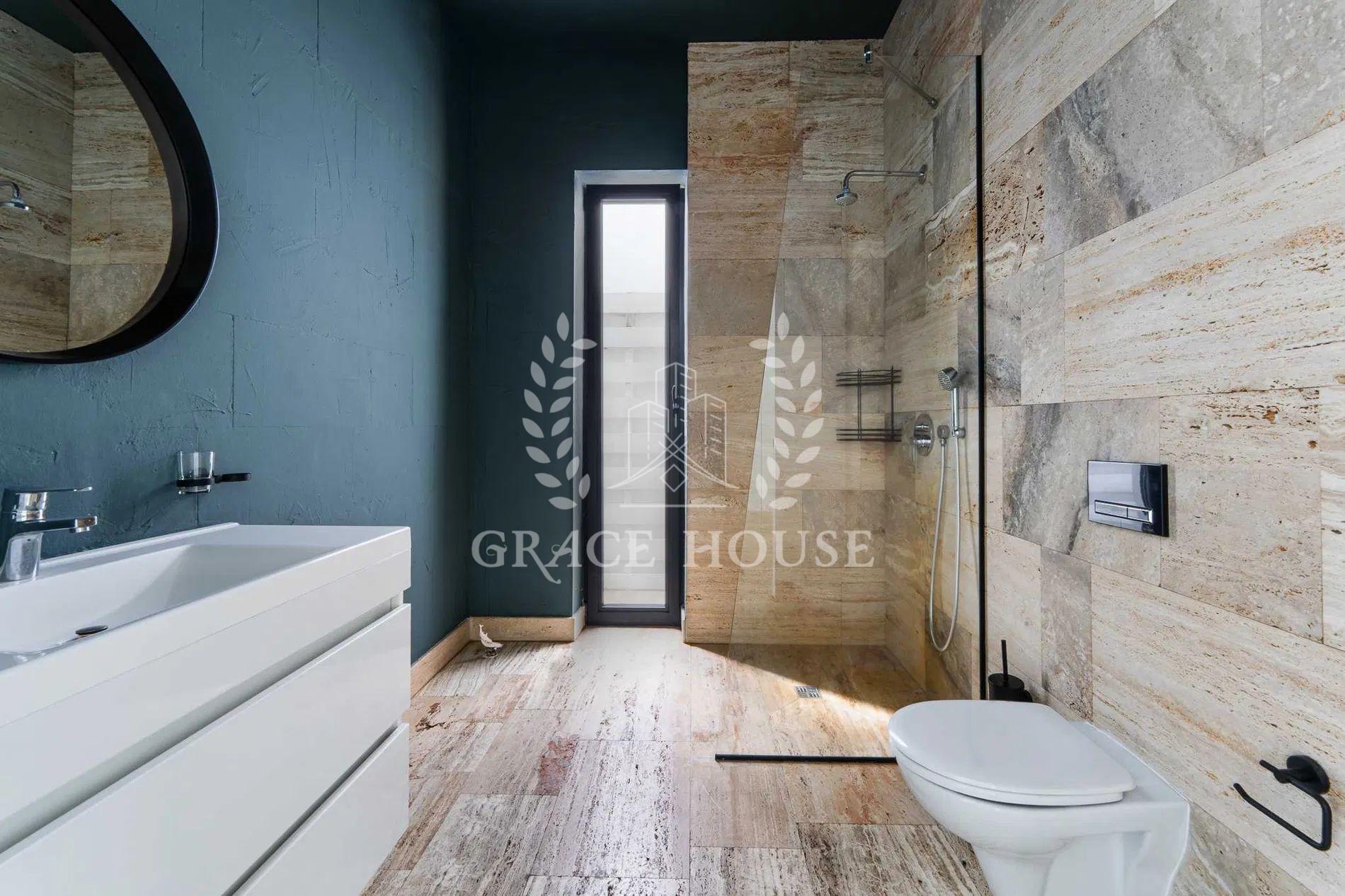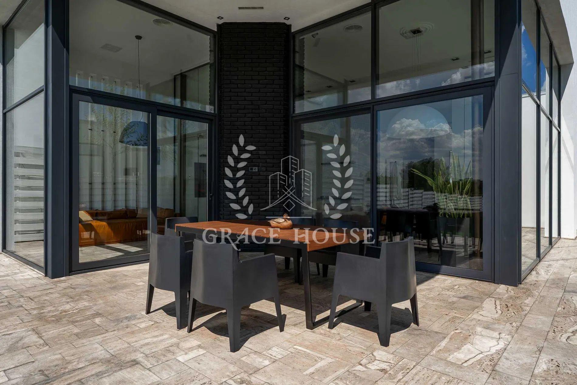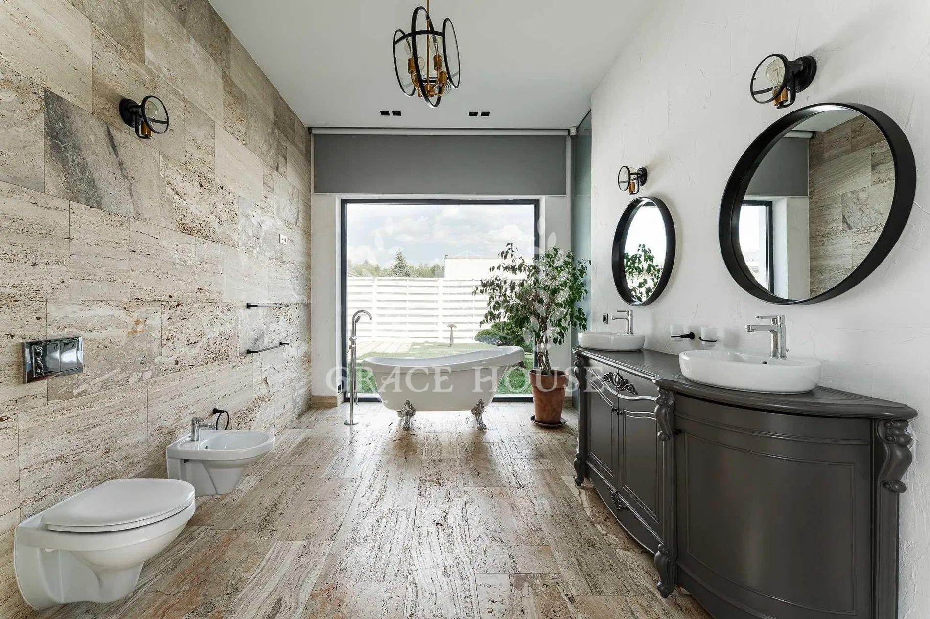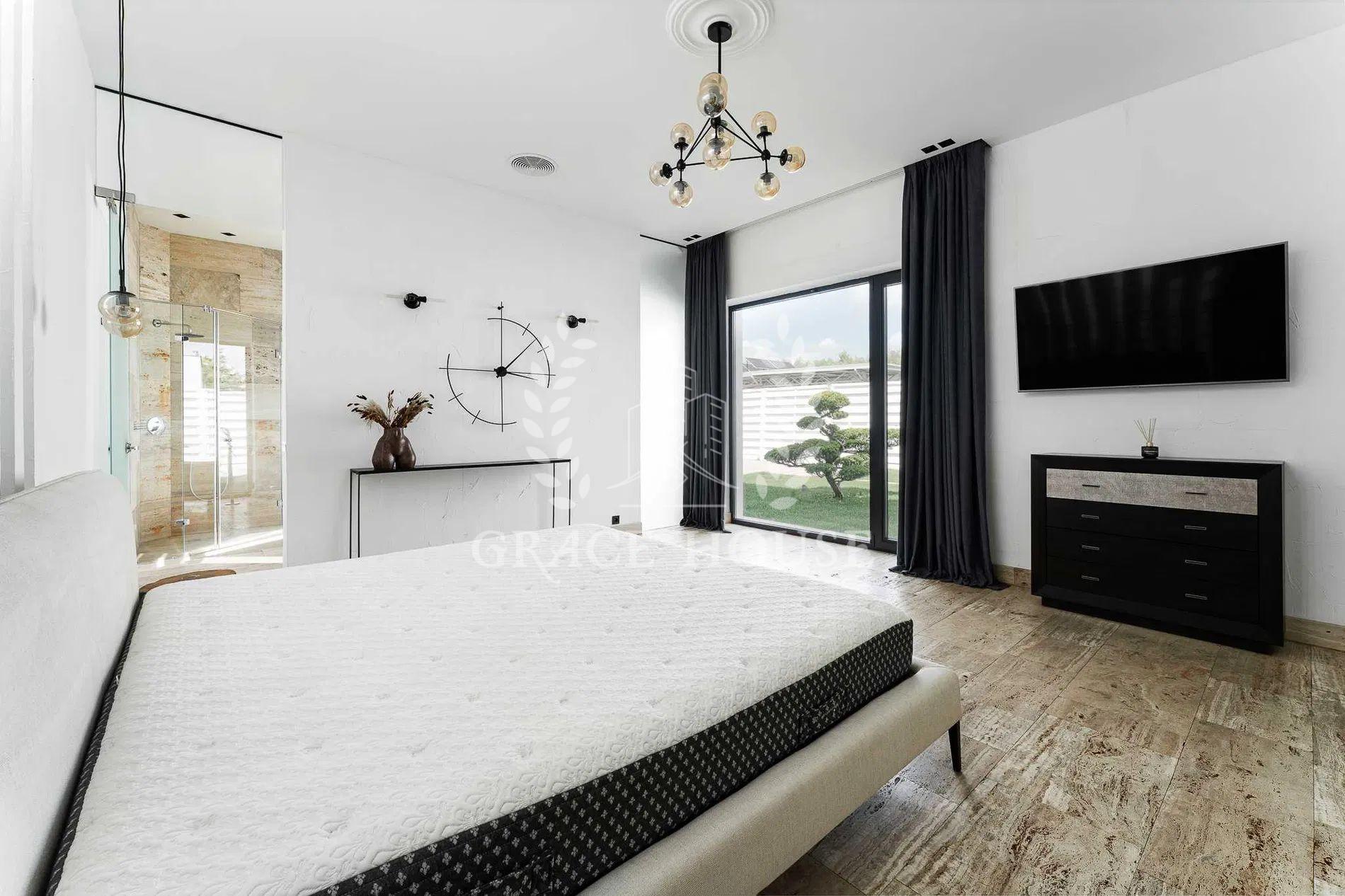 У будинку передбачено простору кухню-вітальню з високою стелею (4 м), головну спальню з власною ванною та гардеробною, дві окремі спальні, кабінет/кімнату відпочинку, два санвузли та низку технічних приміщень. Оселя повністю укомплектована меблями та готова до проживання без додаткових вкладень.