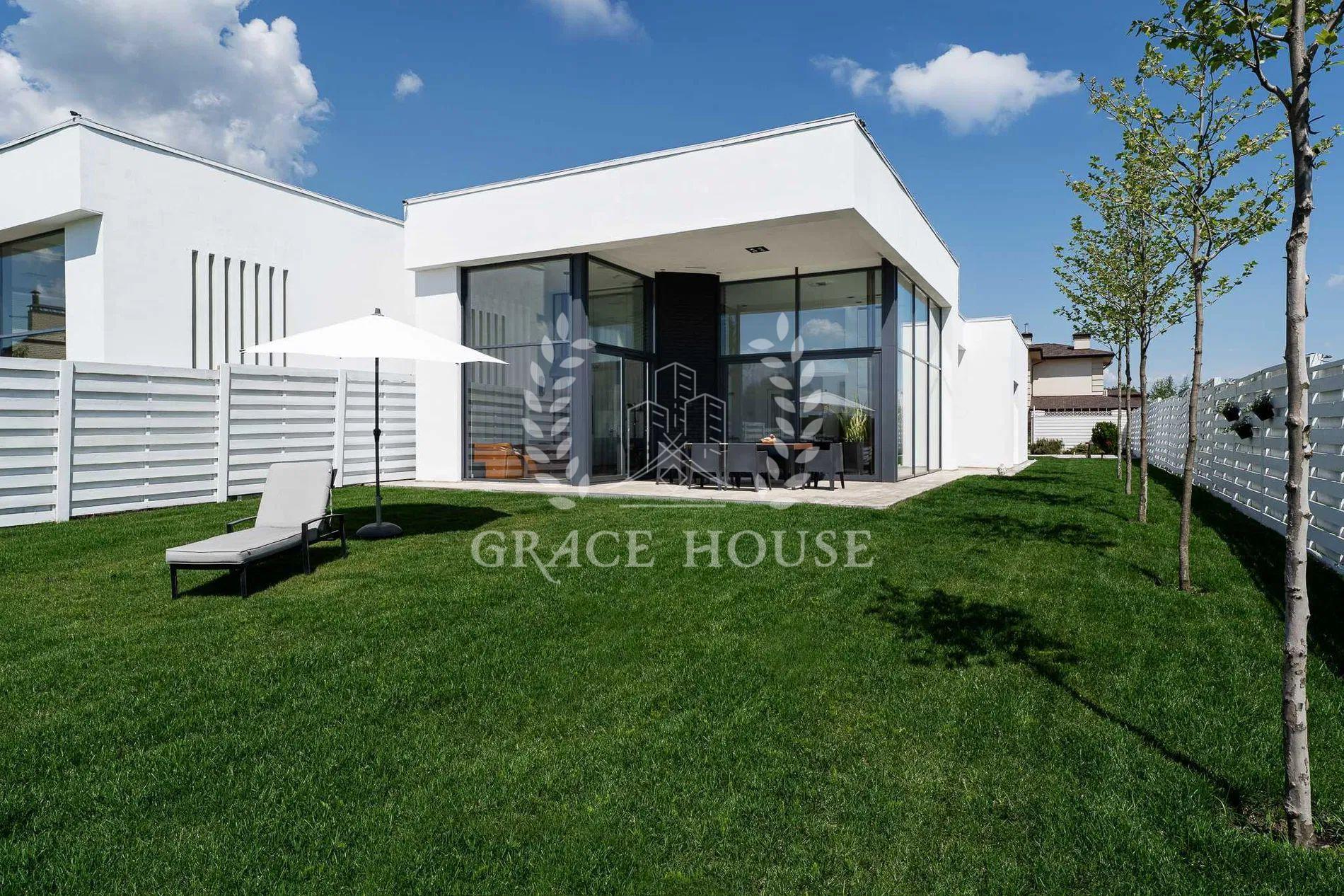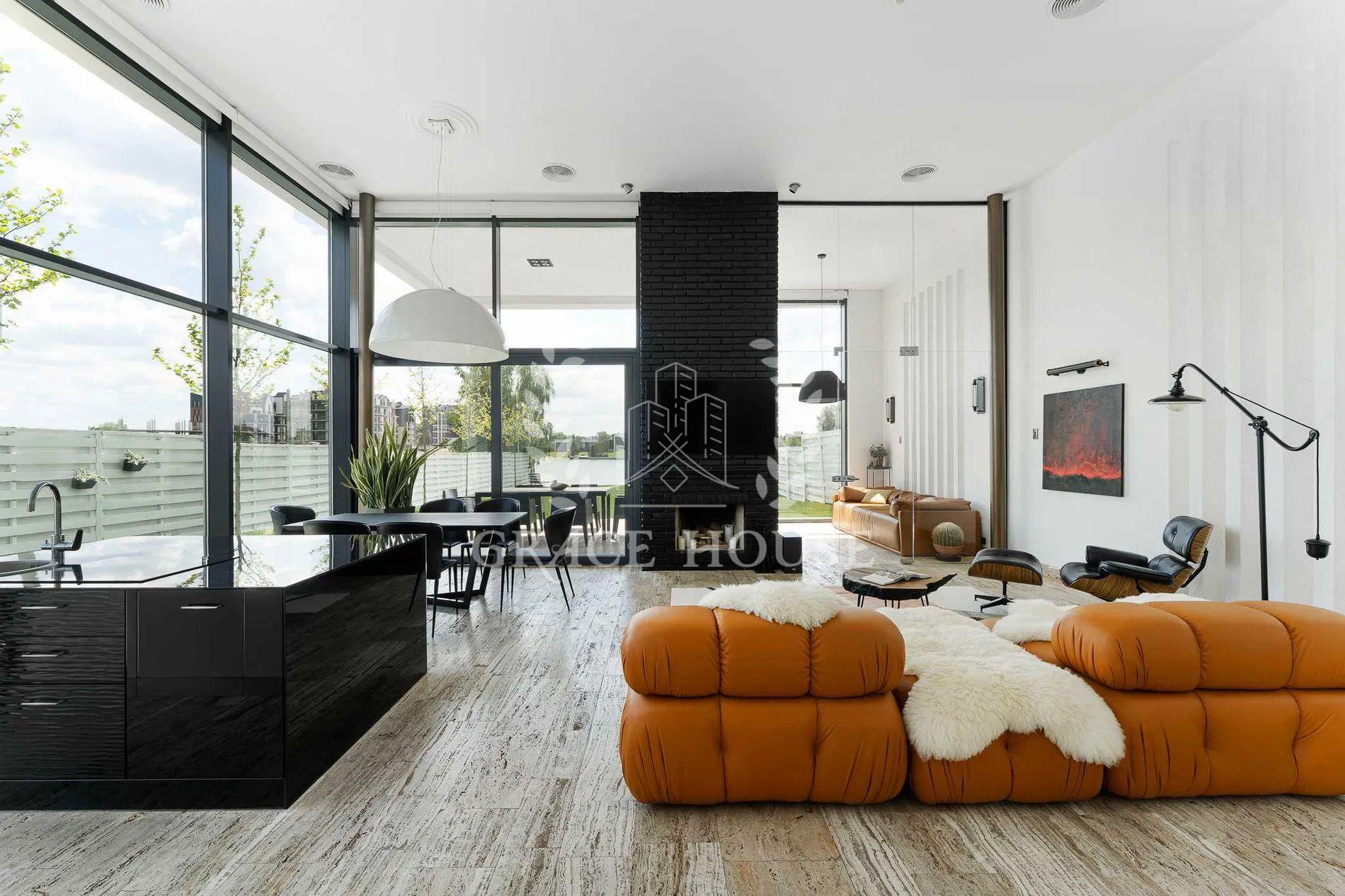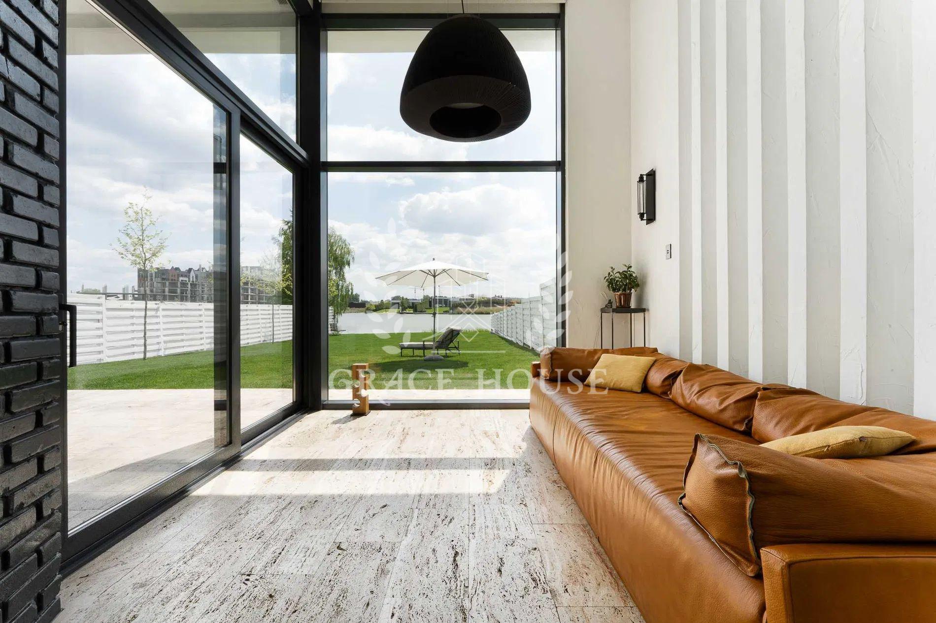 У здачу пропонується стильний заміський будинок із прямим доступом до водойми, розташований у закритому котеджному комплексі «Хутір Ясний» поблизу Лісників/Ходосівки (Обухівський напрямок).