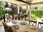 - Простора вітальня з обідньою зоною, каміном та панорамними вікнами, з яких відкривається чудовий краєвид на сад та вихід на терасу, друге світло;