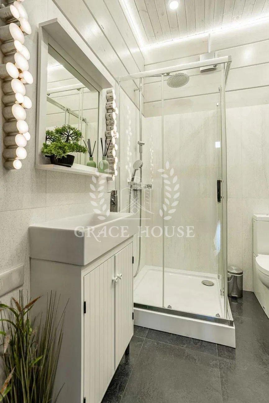 У будинку виконаний ремонт у світлих тонах із використанням якісних природніх матеріалів, що гармонійно поєднує сучасний стиль із класичною елегантністю. Простір наповнений світлом завдяки великим вікнам, що створюють відчуття легкості та простору.