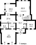 1-й этаж: гостиная, камин на дровах, сан.узел, кухня, отдельная столовая с выходом во двор, гостевая спальная комната, гараж на два авто, кладовая, котельная.