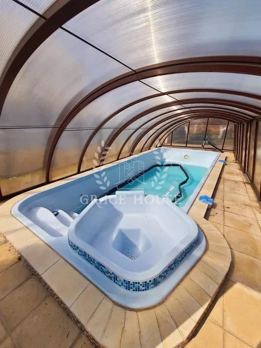 Участок 12 соток: бассейн на улице под накрытием, беседка и зона барбекю,