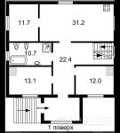 1й этаж – предбанник, коридор, 2 комнаты, санузел, гостиная, кухня. Лестница на 2й этаж, под лестницей кладовка.