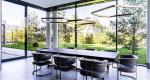 Зал с камином и выходом на террасу, кухня с островом + обеденная зона с панорамным видом (высота окон 6 метров)