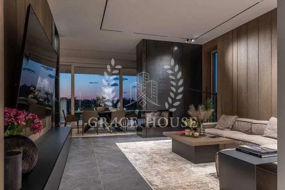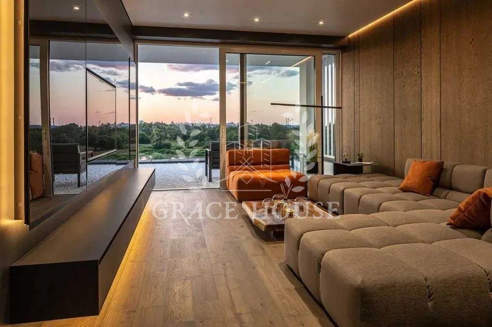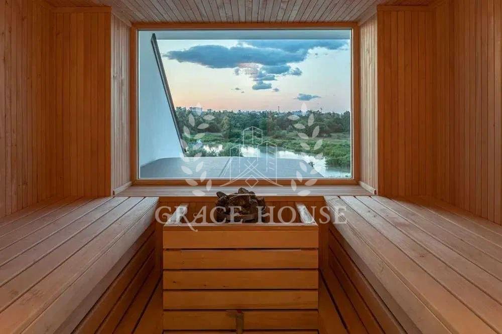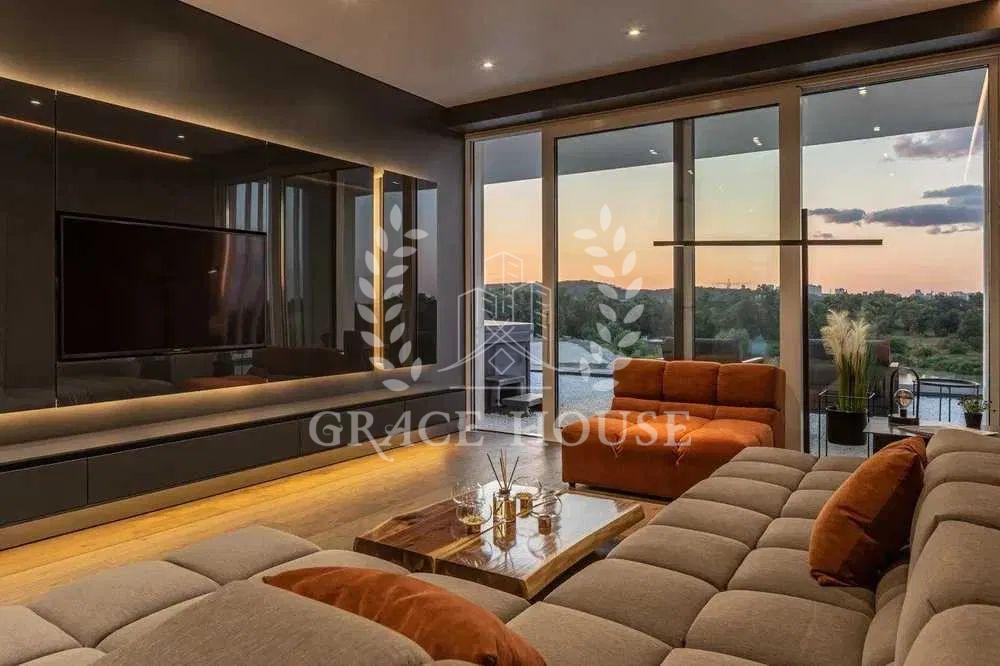 Общая площадь 280м2. 3 этажа. Планировкой предусмотрено: кухня, столовая, гостиная с трехсторонним камином, гардеробные, терраса, мастер-спальня, 2 детские комнаты, 5 с/у, лаунж-зона с выходом на видовую террасу, имеющую джакузи, сауна, бытовая комната.