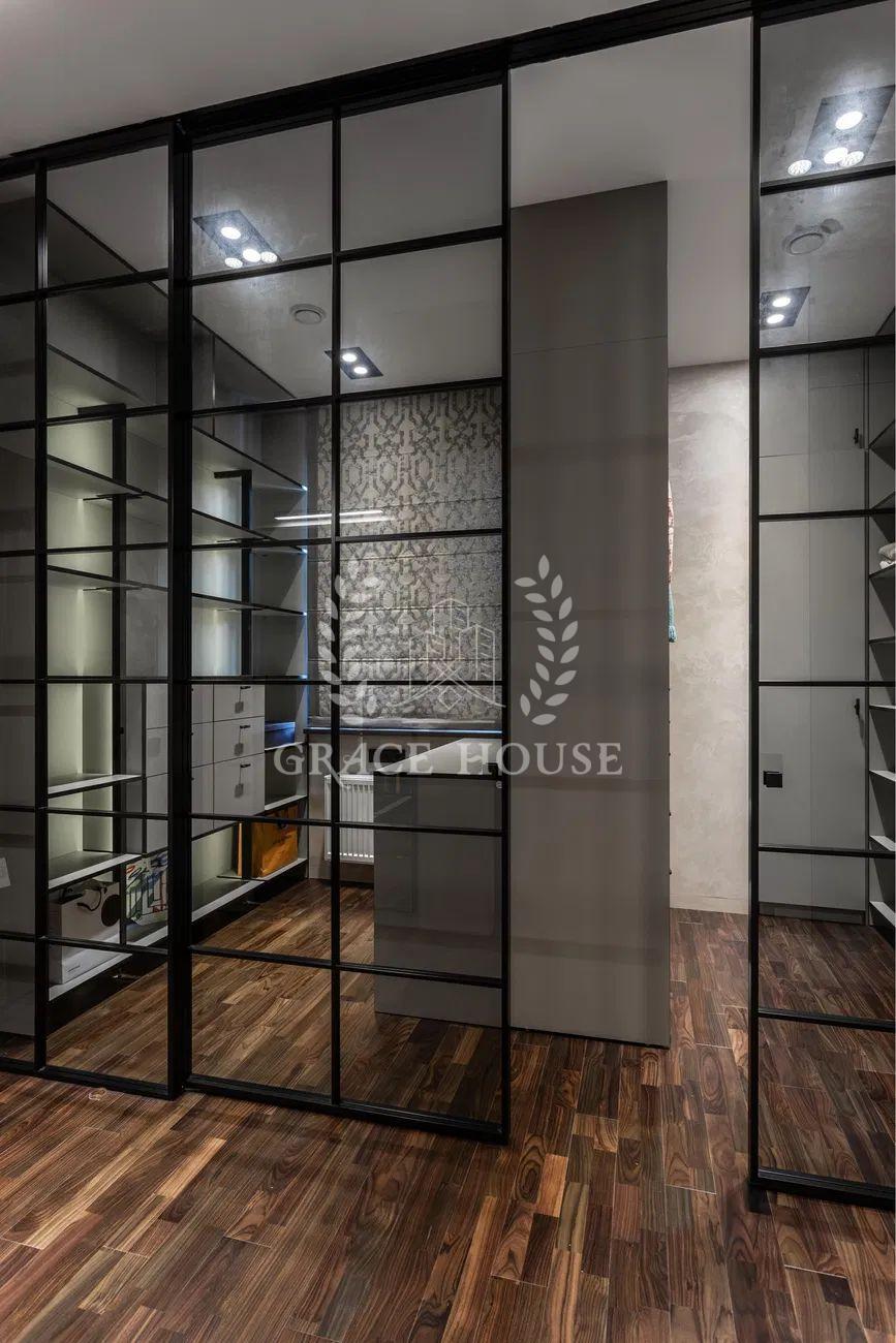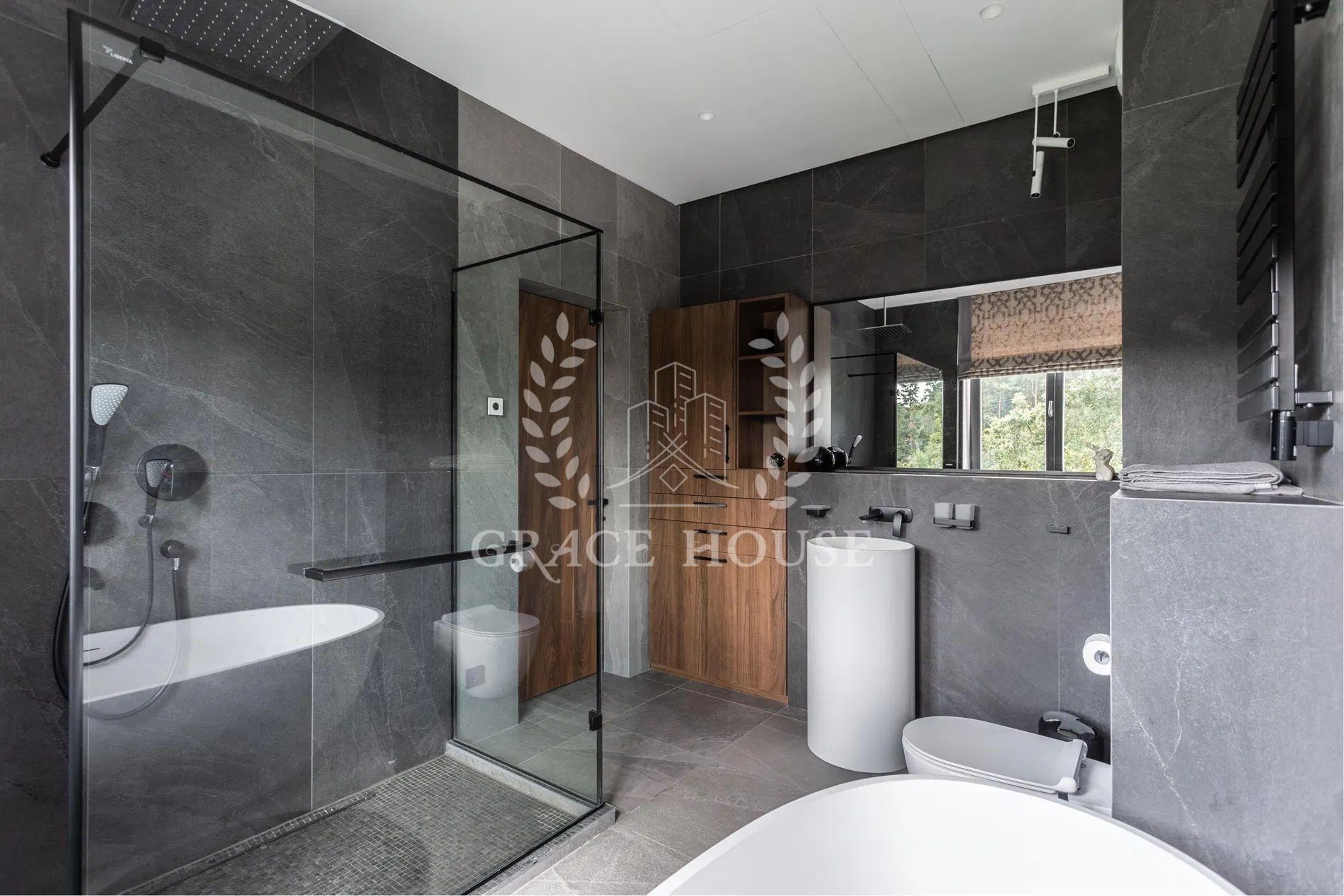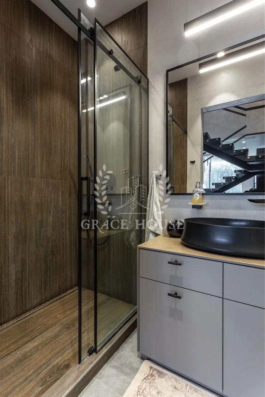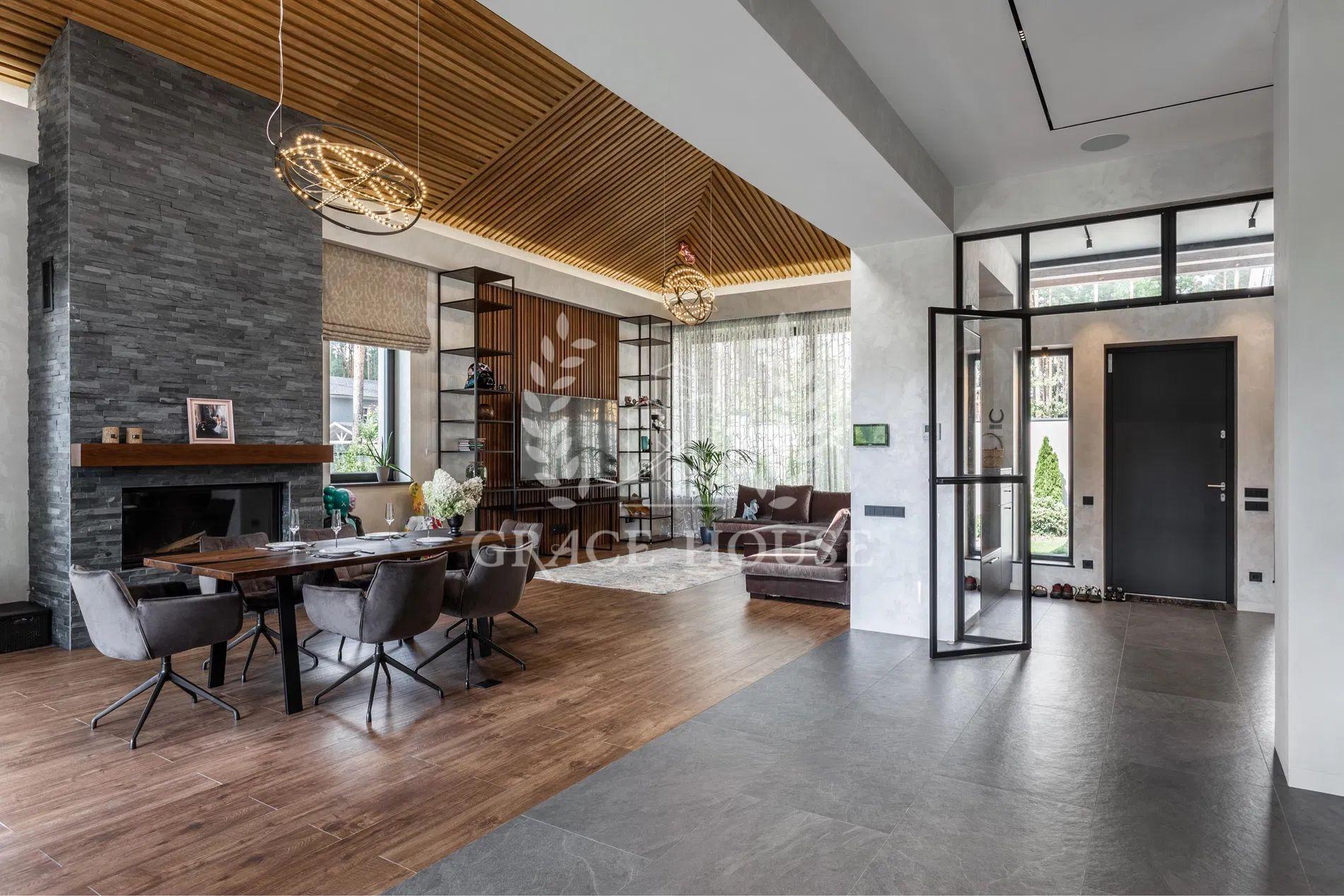 Будинок має 5 кімнат: майстер-спальню з власною гардеробною, дві дитячі з ігровою зоною і своїм санвузлом, гостьову, кабінет і вітальню. Простора кухня-вітальня з виходом на терасу, сімейний кінозал, гардеробні, технічні зони, теплий гараж на 2 авто з автоматичними воротами.