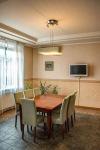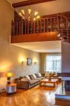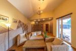 Три спальни (основная с лоджией), кабинет, две ванные комнаты, холл, библиотека, гостиная с камином, кухня-столовая, летняя терраса из кухни.