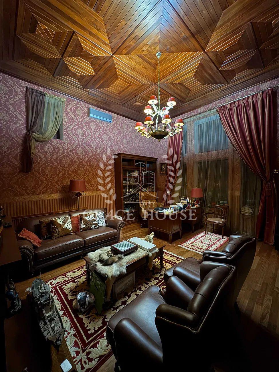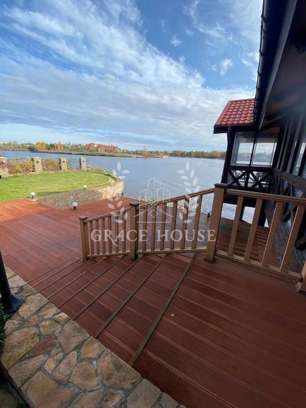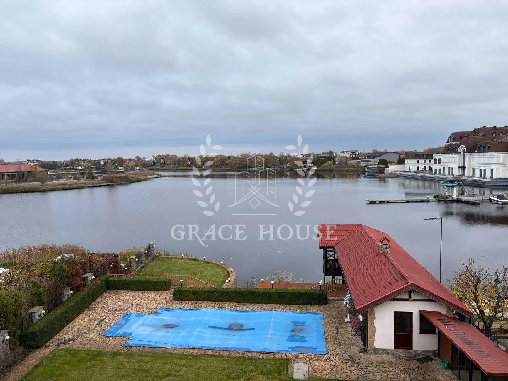 Построен в классическом стиле с использованием природных качественных материалов, ухоженный участок с ландшафтным дизайном, бассейном, барбекю на воде, собственным пирсом с выходом в Днепр.