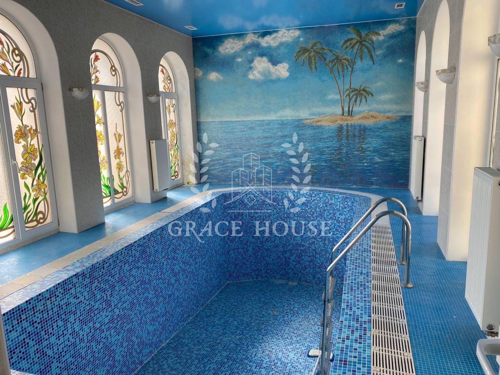1 этаж: зал с камином, столовая, кухня , коридор-галерея, спальня, бассейн, санузел с душевой кабиной.