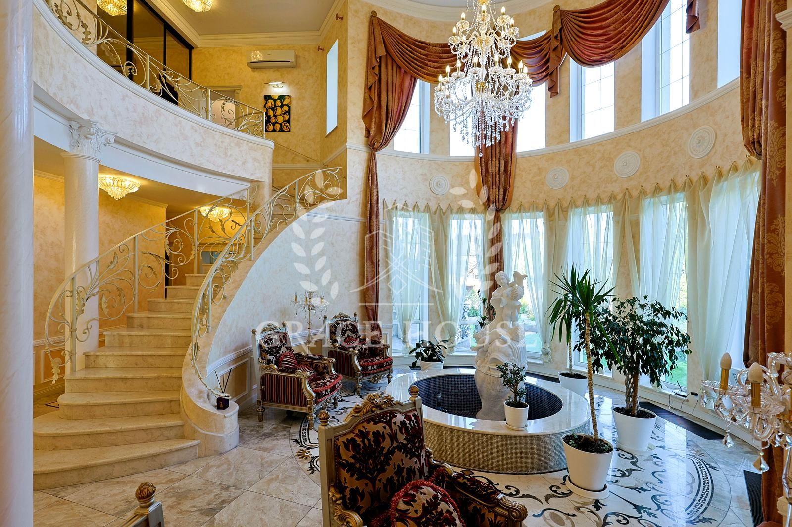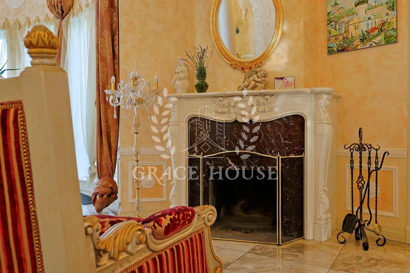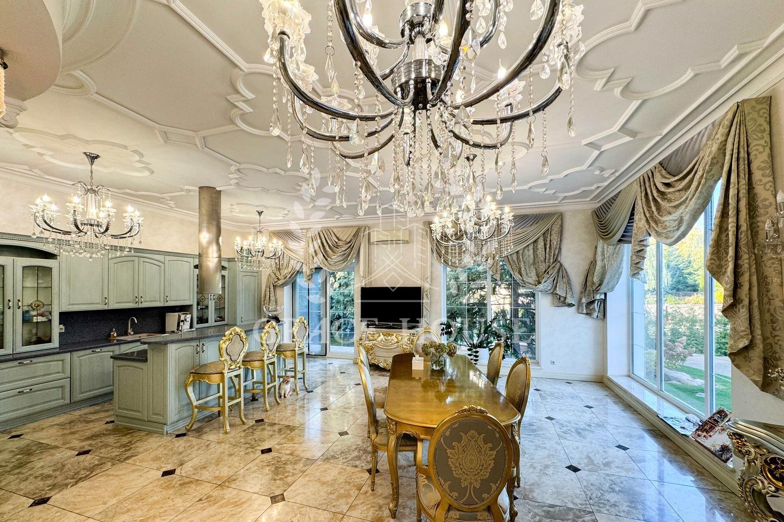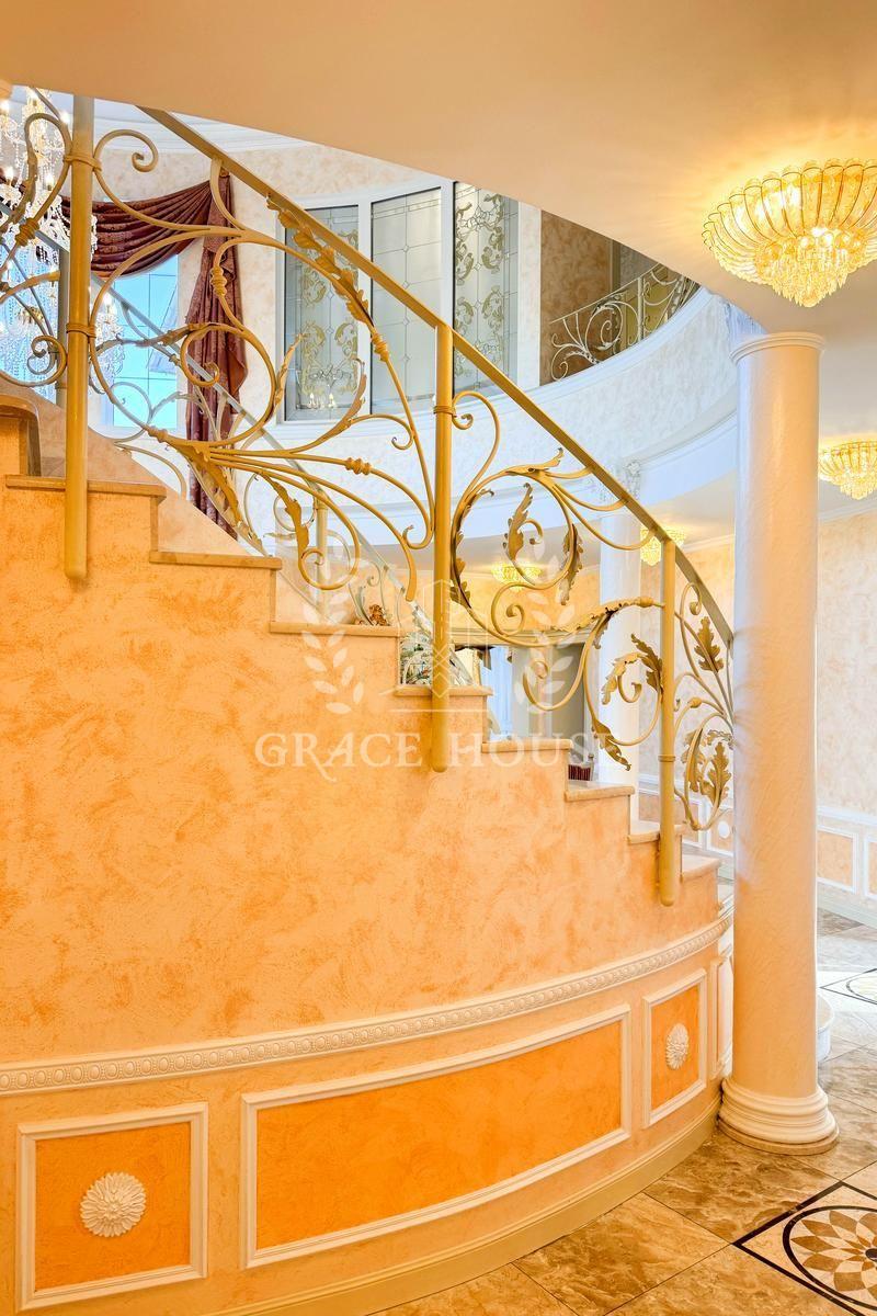 Цей розкішний котедж створений для тих, хто цінує комфорт, стиль і енергію справжнього затишку. У дизайні поєднані натуральні матеріали, зокрема італійський мармур, меблі та сантехніка від світових брендів, а змішувачі прикрашені кристалами Swarovski. Біля входу — дві мармурові статуї левів, що охороняють стабільність і гармонію дому. Інтер’єр прикрашають коштовні люстри з кришталю, що переливаються у світлі сонця, розкішні мармурові сходи та камін додає тепла та затишку зимовими вечорами. Цей дім буквально заряджає позитивною енергетикою, наповнює любов’ю — звідси не хочеться йти.