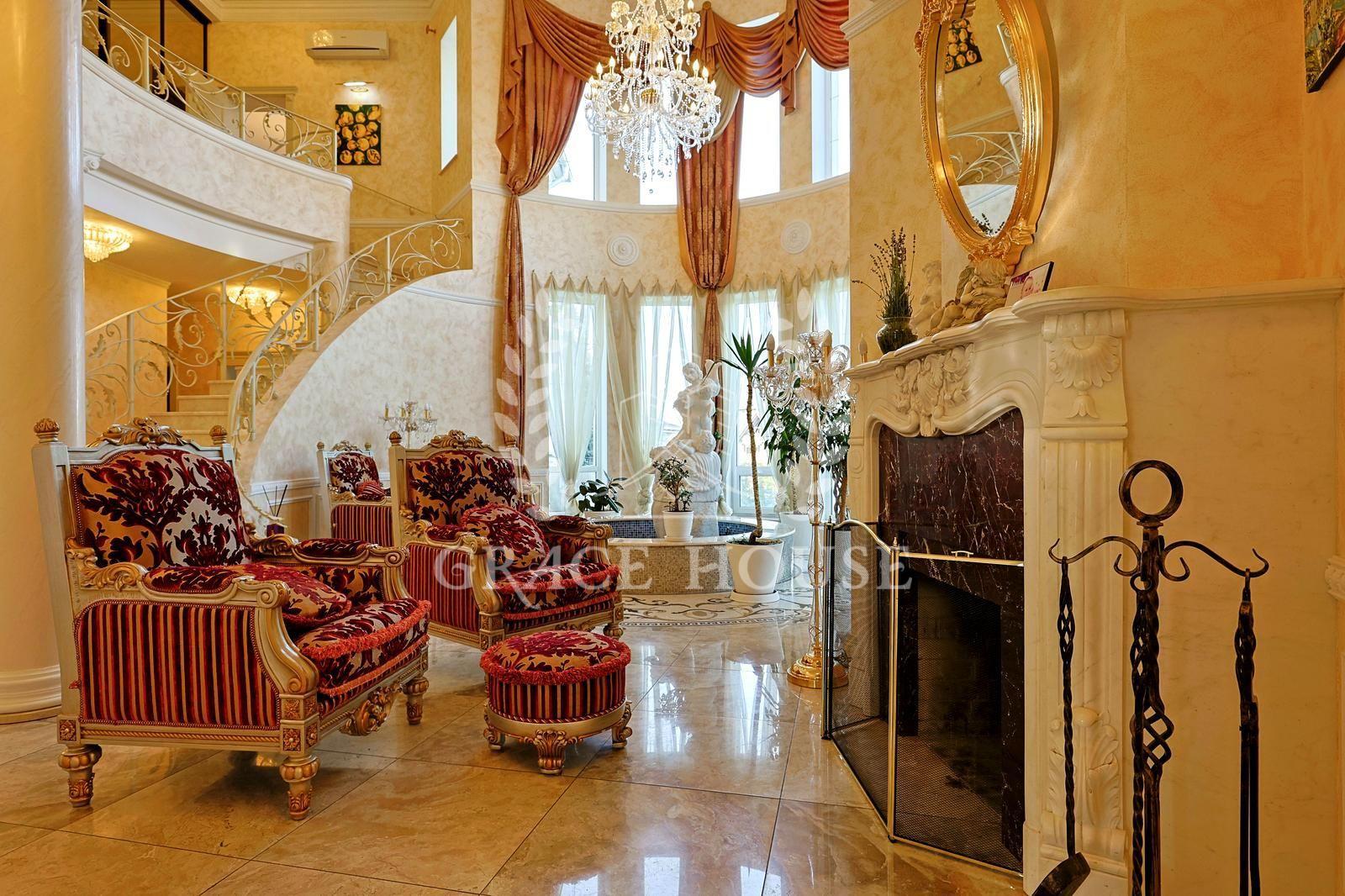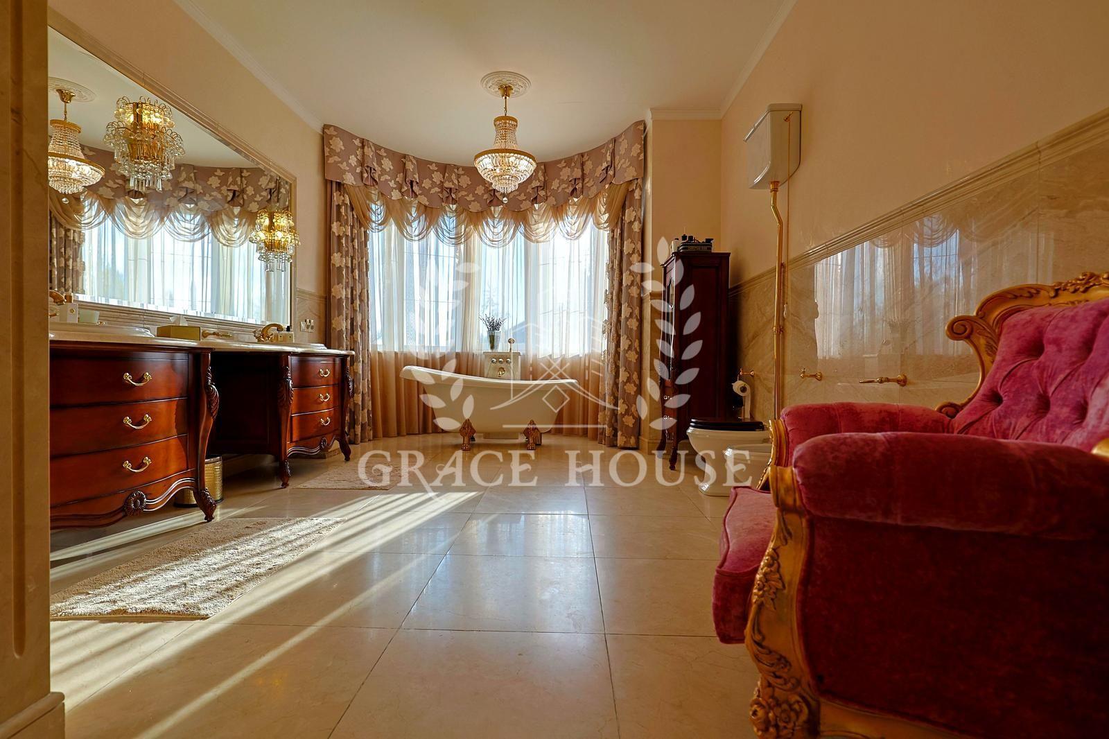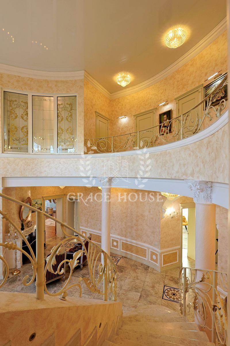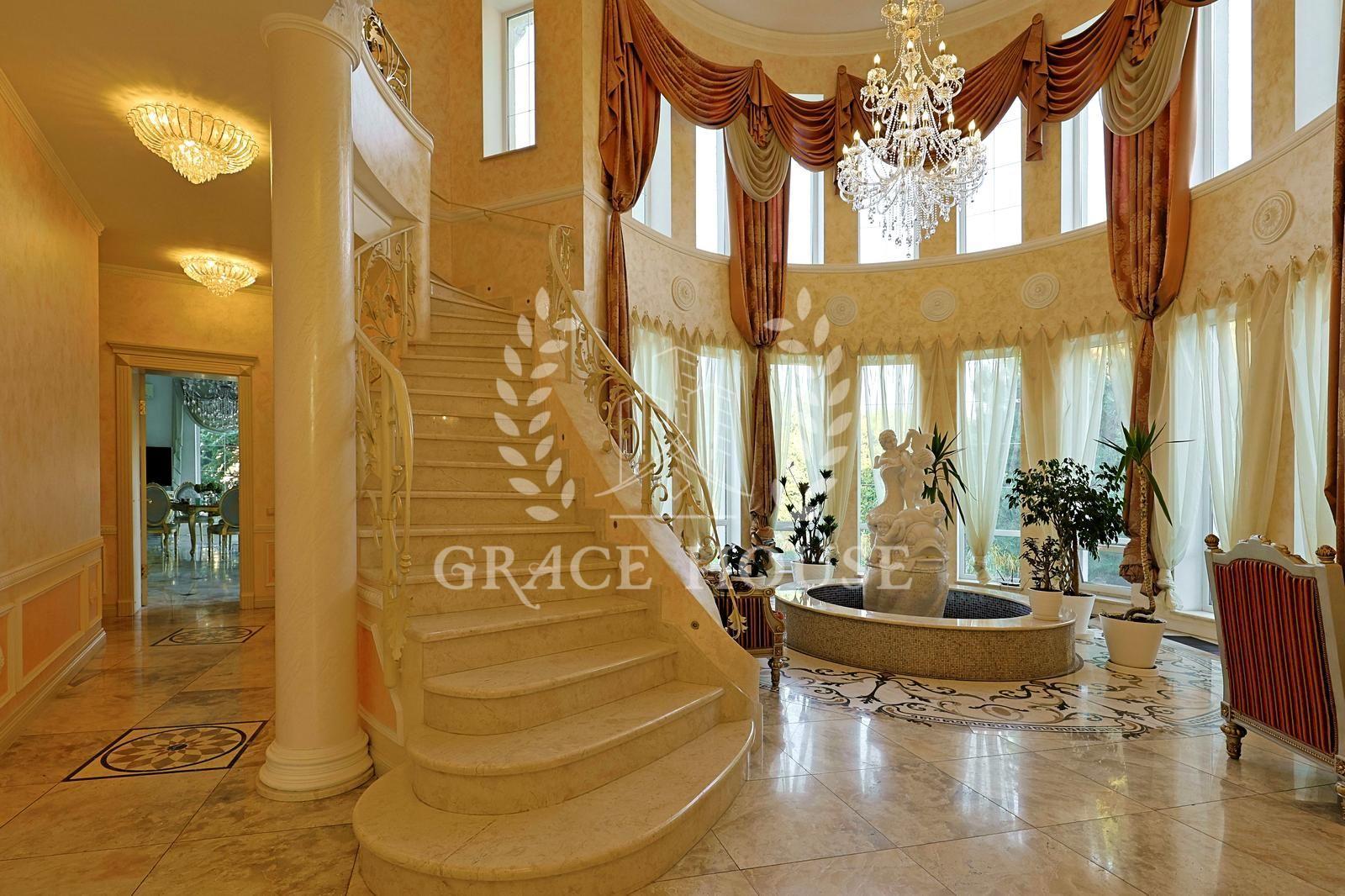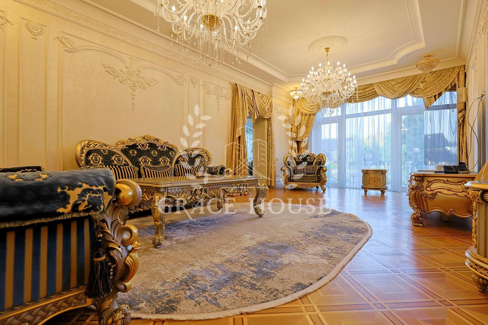Цей розкішний котедж створений для тих, хто цінує комфорт, стиль і енергію справжнього затишку. У дизайні поєднані натуральні матеріали, зокрема італійський мармур, меблі та сантехніка від світових брендів, а змішувачі прикрашені кристалами Swarovski. Біля входу — дві мармурові статуї левів, що охороняють стабільність і гармонію дому. Інтер’єр прикрашають коштовні люстри з кришталю, що переливаються у світлі сонця, розкішні мармурові сходи та камін додає тепла та затишку зимовими вечорами. Цей дім буквально заряджає позитивною енергетикою, наповнює любов’ю — звідси не хочеться йти.