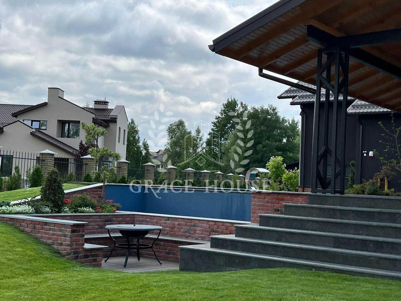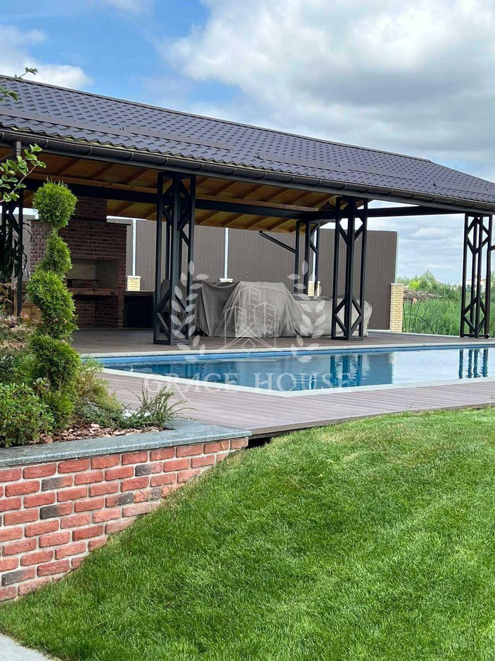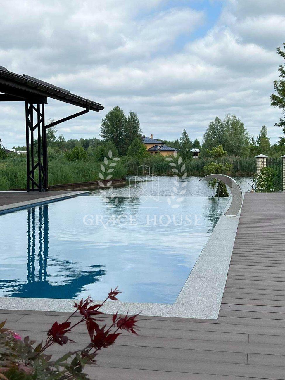 Современный новый дом в охраняемом КГ в Плютах. Постройка 2021 года. Общая площадь дома 430кв.м, 28 соток с выходом на Козинку, большая гостиная, 4 спальни, кабинет, большой бассейн, беседка , отдельно дом охраны, прислуги. В строительстве дома использовались натуральные, экологически чистые материалы. Теплонасосы. Есть дизельный генератор. Фундамент сваи, стены кирпич, крыша металлочерепица. Скважина 64м, 25 кВт. Видеонаблюдение по периметру.