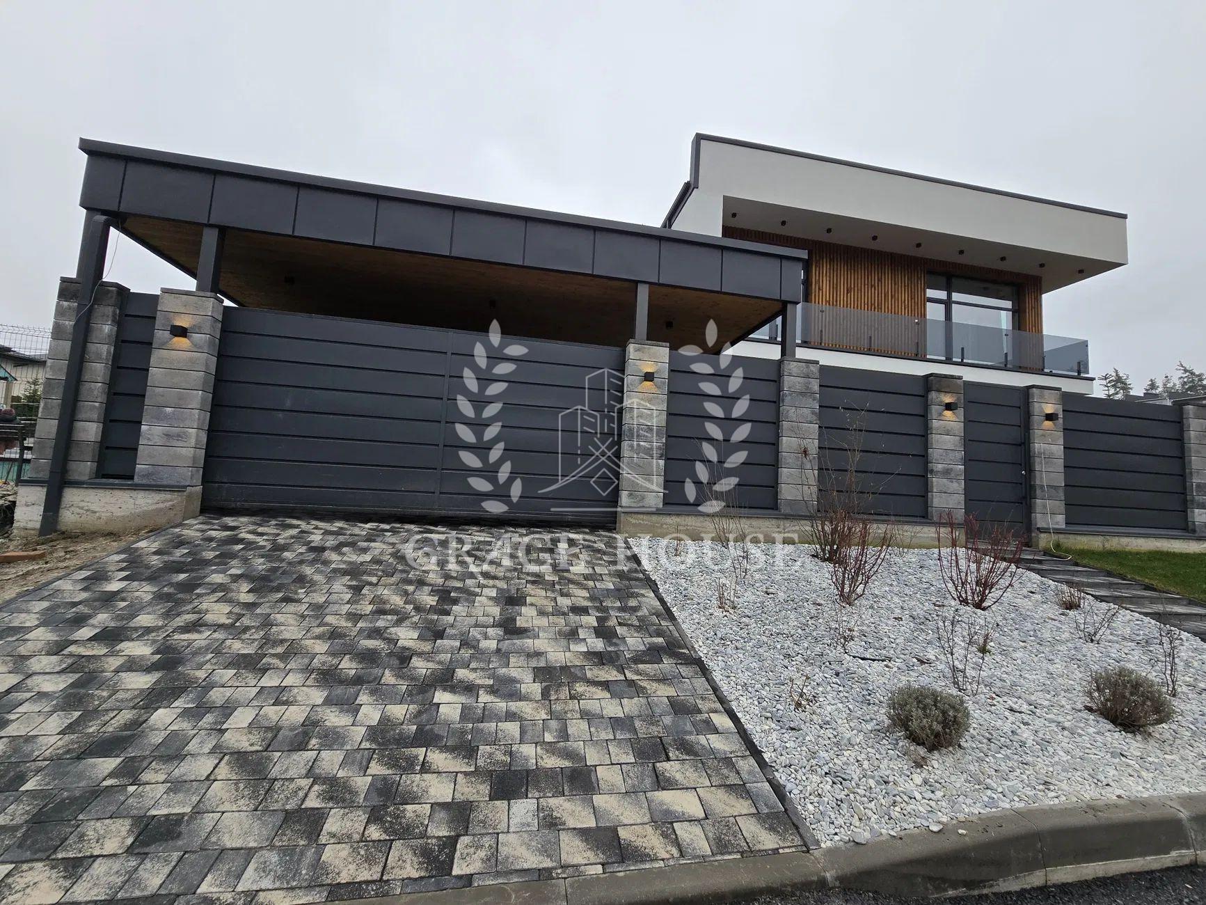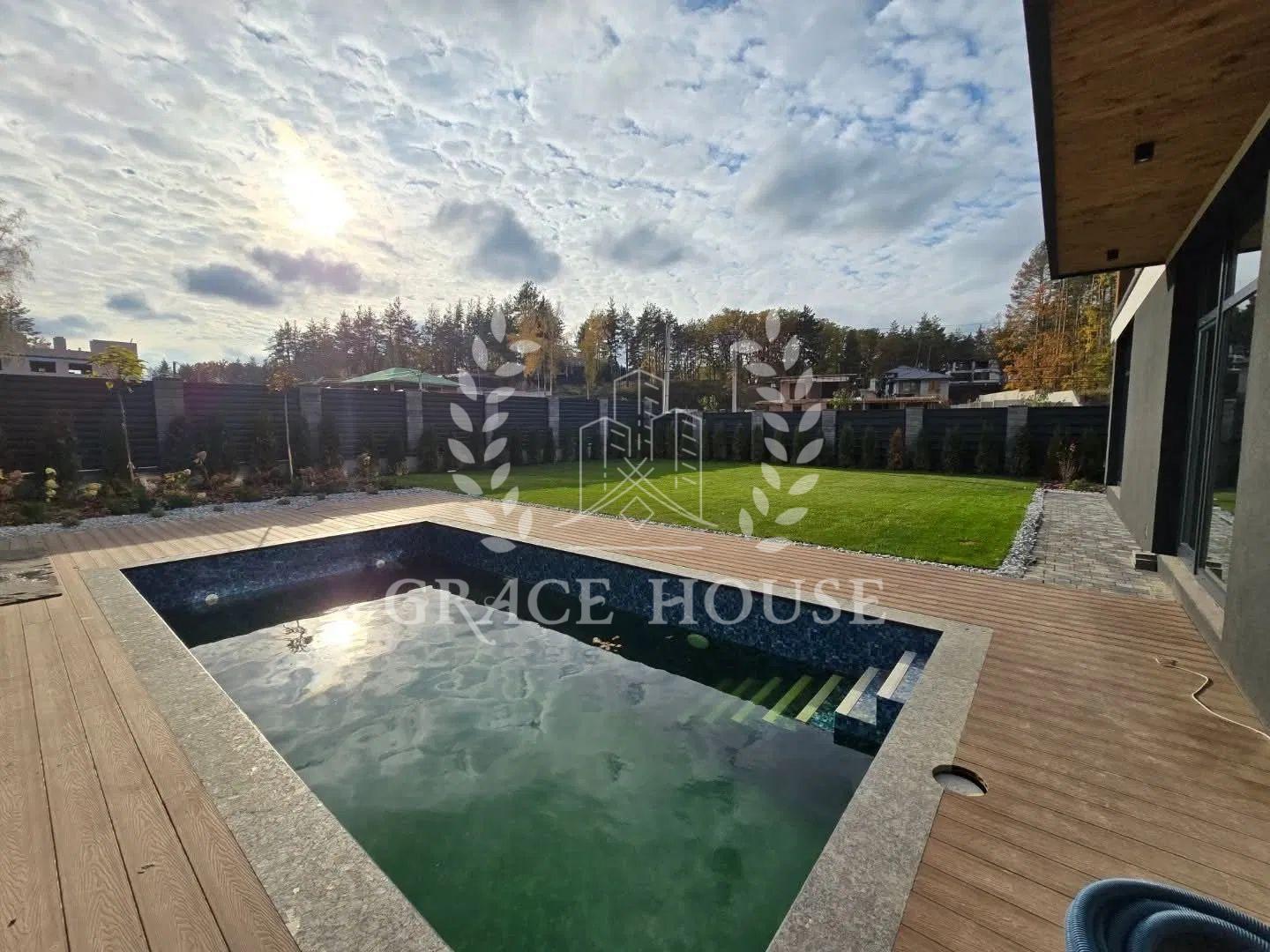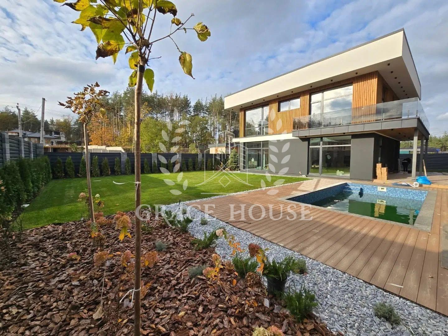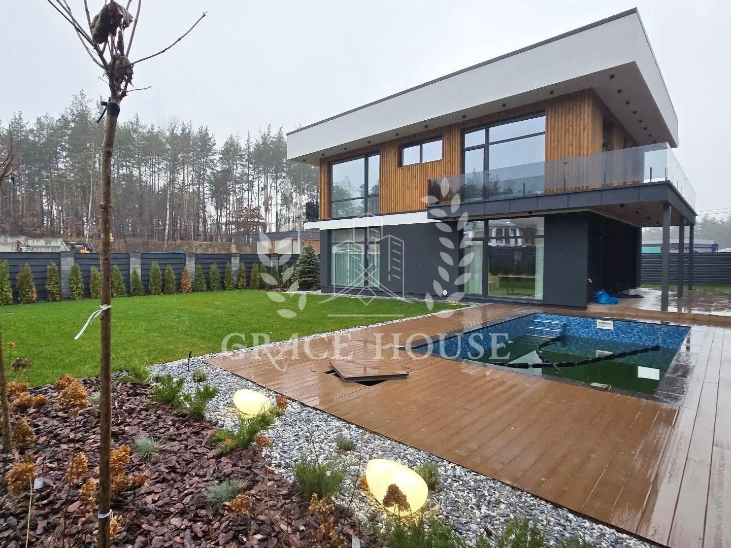 Будинок біля лісу 230 м2 з терасою, є підсобне приміщення, з будинка відкривається панорама на ліс. Є басейн , навіс на 2 авто .