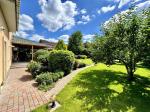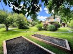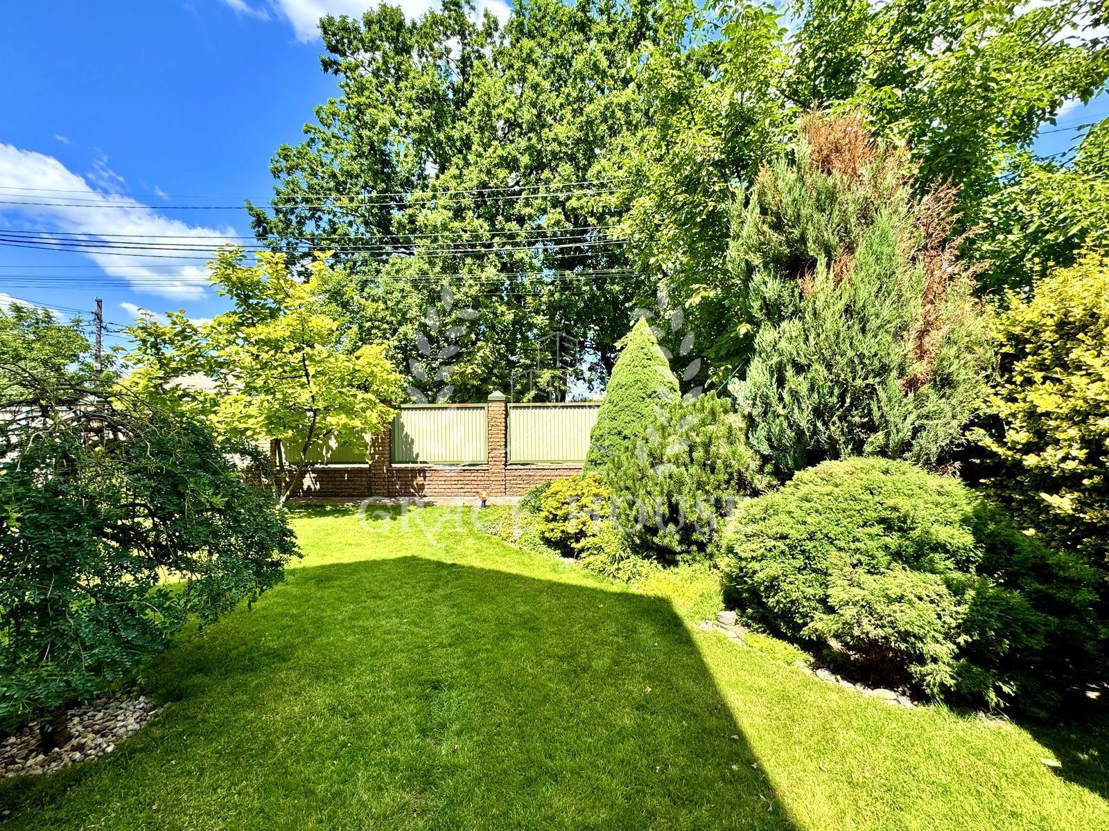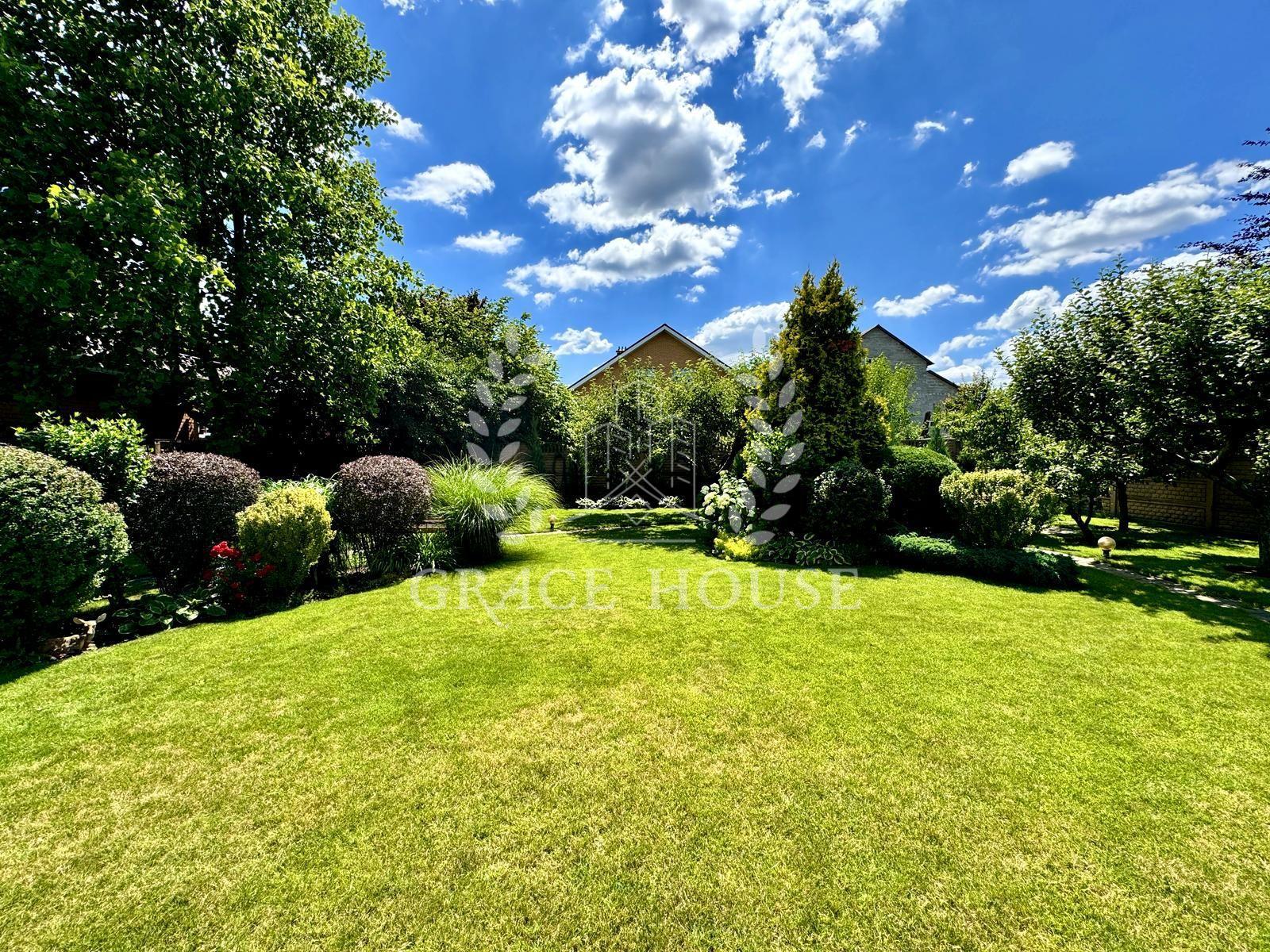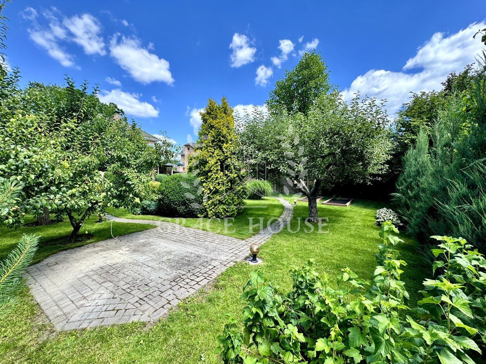 - ландшафтний дизайн, зелений газон, квіти, плодові дерева та кущі;