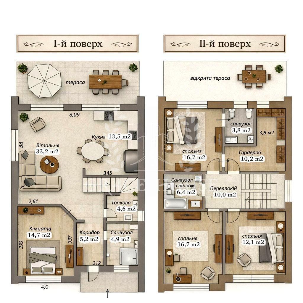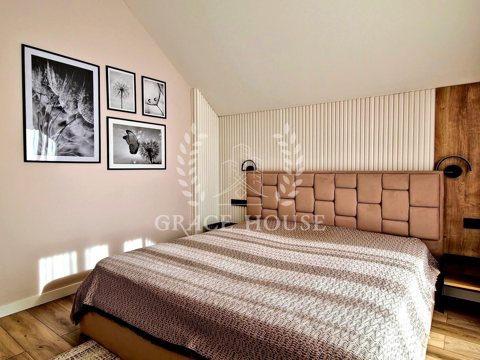 Три спальні, гардероб 10,2 м², два санвузли (один з вікном і ванною), вихід на відкриту терасу.