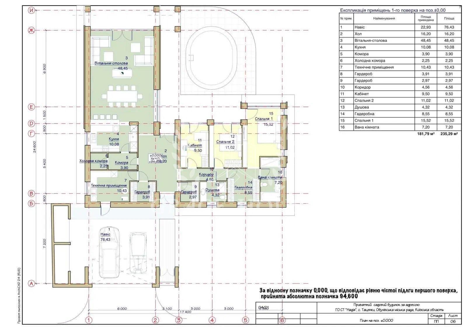 Перекриття монолітні. Покрівля скатна – фальцеві панелі, плоска – гідроізоляційна ПВХ мембрана, утеплювач 300мм. Підлога - залізобетонна монолітна плита, утеплювач 150мм, водяна тепла підлога (санвузли, вітальня, кухня, камінний зал, прохід в спальні кімнати), стяжка 100мм посилена арматурною сіткою. Вікна – панорамні, енергозберігаючі із двокамерними склопакетами, заповненими інертним газом аргон. У проекті передбачена можливість встановлення припливно-витяжної вентиляції з рекуперацією енергії, опціонально з функціями обігріву, охолодження та фільтрації повітря.